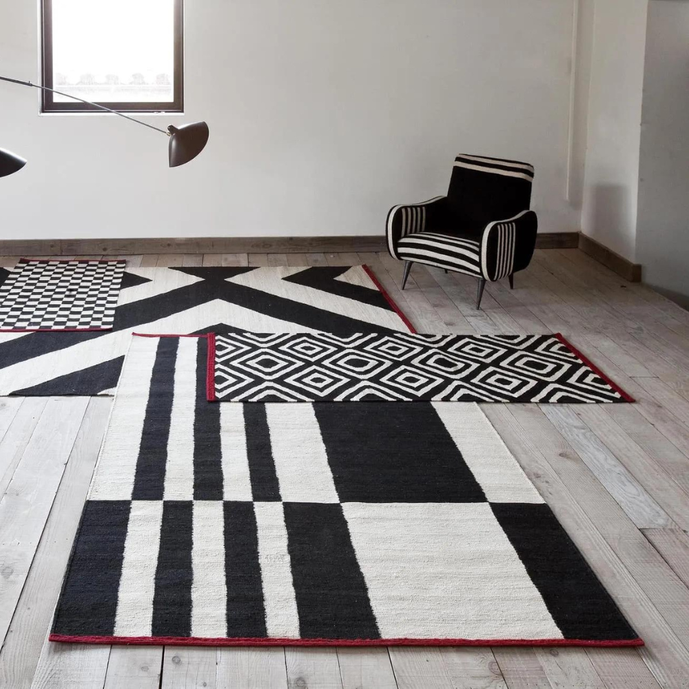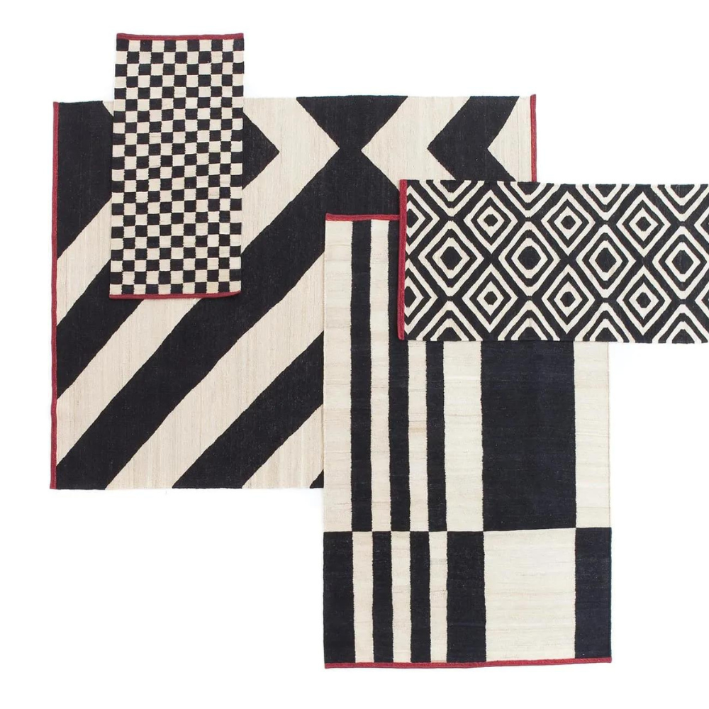 Alfombra rectangular tipo kilim de 200x300 cms en 100% lana afgana con patrones blancos, negros y bordes rojos. Diseño de Sybilla.