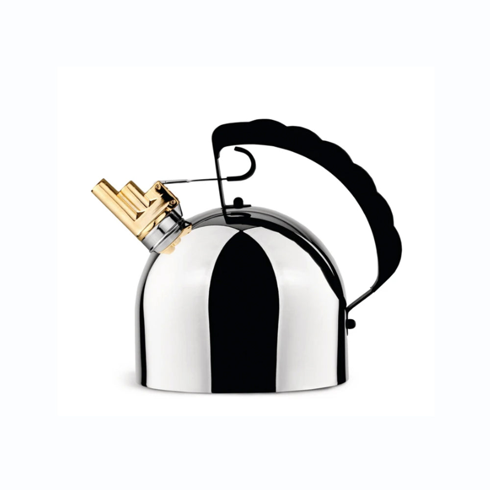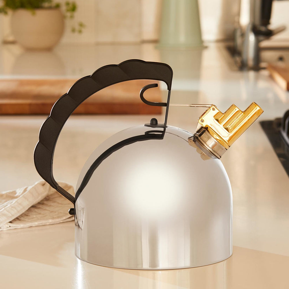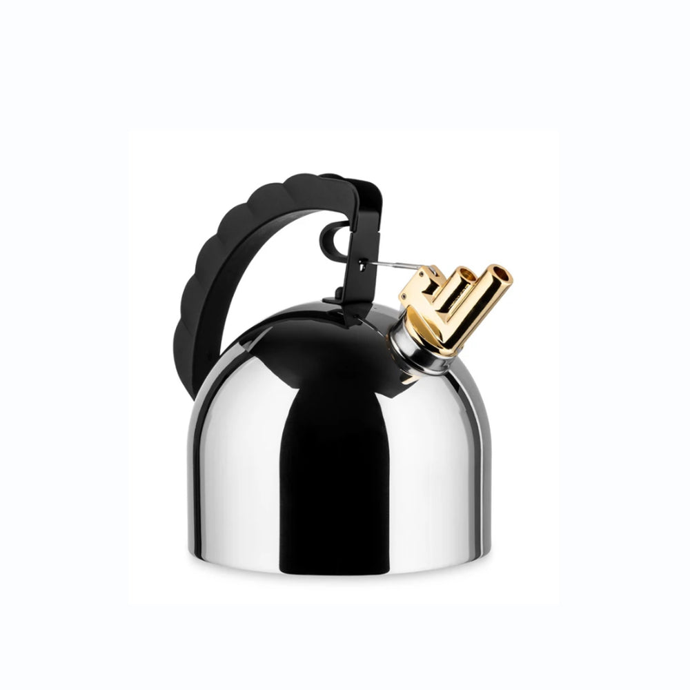 Hervidor de agua en acero inoxidable con chiflete melódico de bronce, fondo termodifusor en cobre y cubre-mango en poliamida. Capacidad 2 litros.