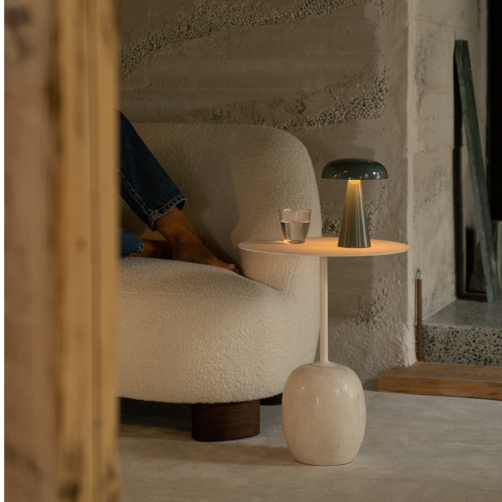 Mesa lateral con base en mármol Crema Diva y cubierta ovalada en acero color marfil. Diseñado por Luca Nichetto.