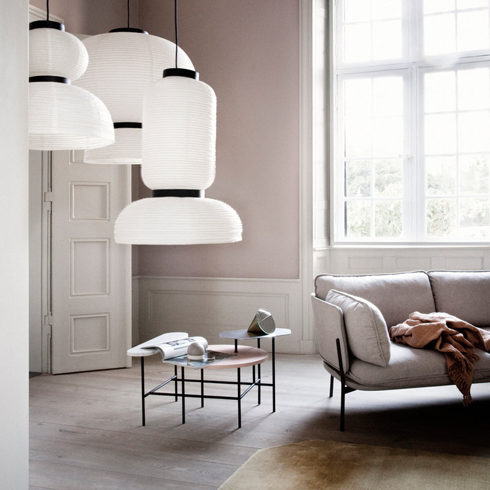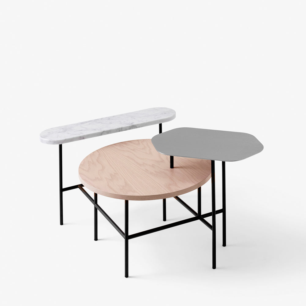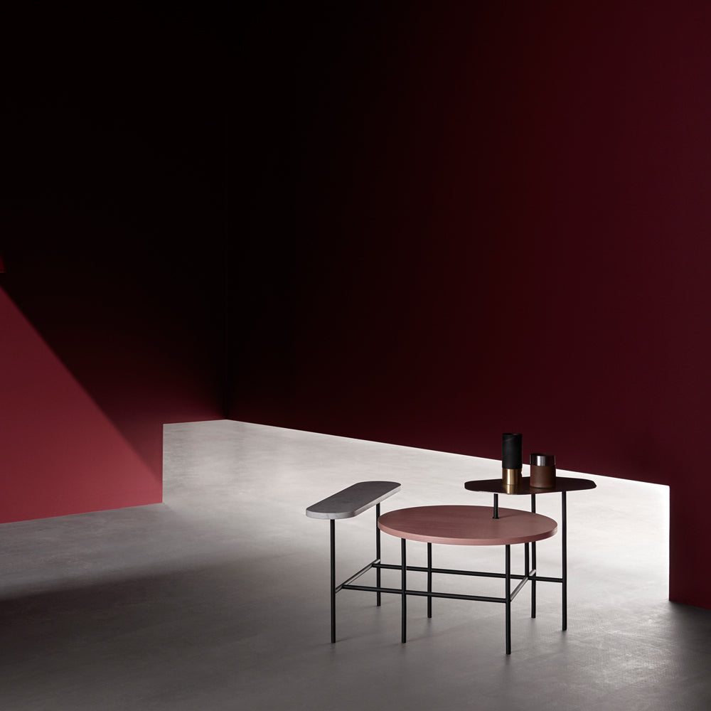 Mesa lateral en acero negro y cubiertas de marmol Carrara y arce teñido color rosado.