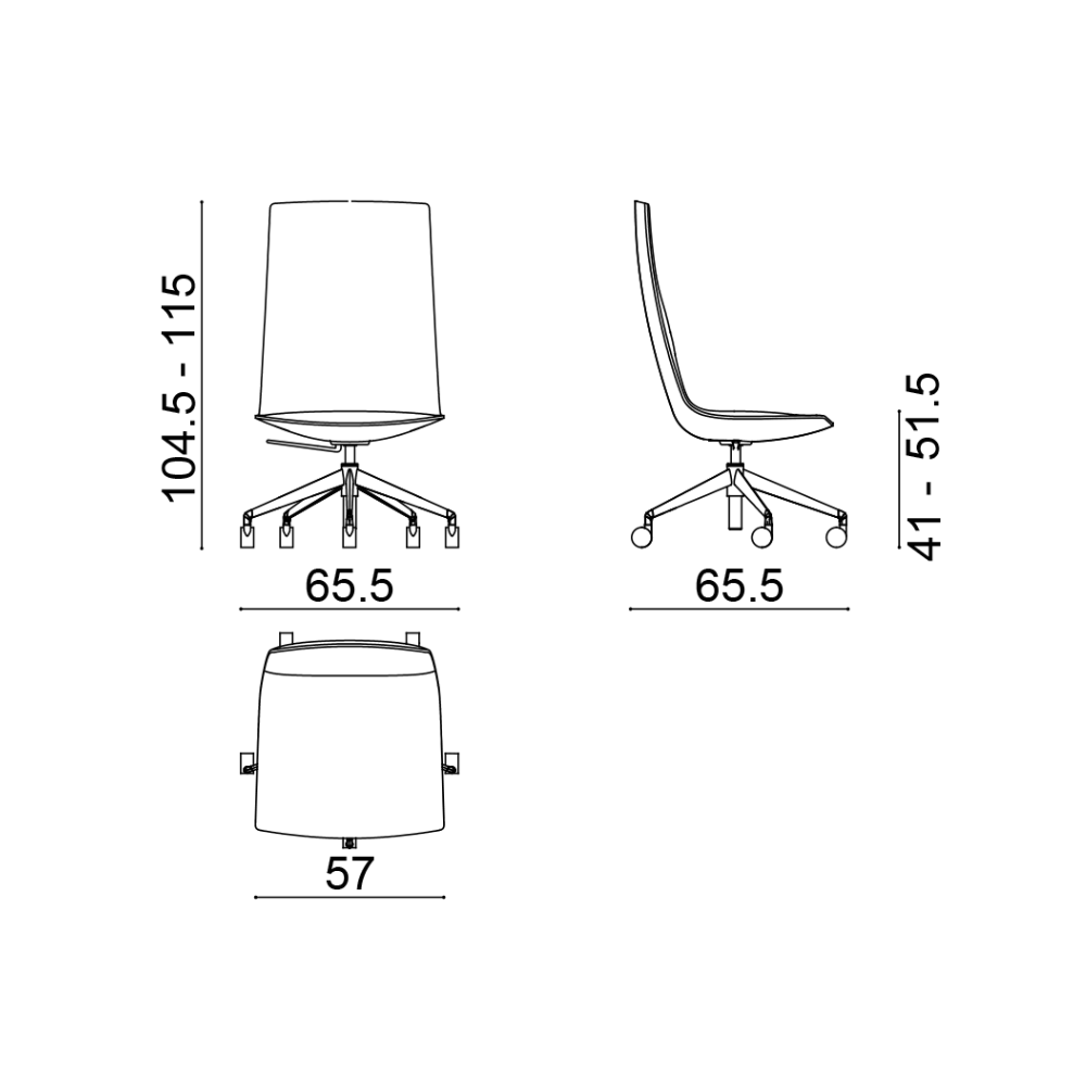 Silla con estructura giratoria de cinco radios sobre ruedas de aluminio brillante, con mecanismo de gas para regular la altura. Carcasa con respaldo medio equipada con mecanismo sincronizado autopesante, completamente tapizada en cuero negro PF00007.  Apoyabrazos de aluminio en el mismo acabado de la estructura.