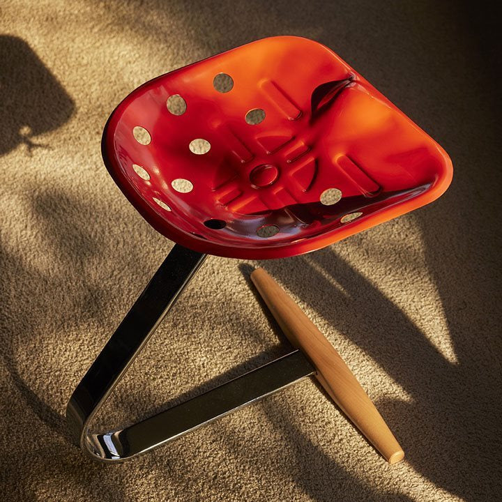 Su estructura —un asiento de tractor apoyado sobre una barra de acero cromado y una base de madera de haya— ensambla materiales y referencias provenientes del mundo agrícola, industrial y náutico.