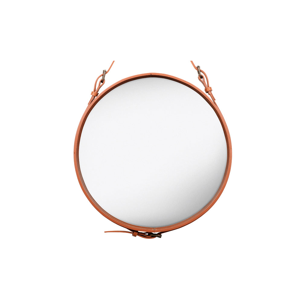 Circular wall mirror, 45 cm in diameter. Designed by Jacques Adnet for Hermès, 1950. Brown Italian leather. Made in Denmark.