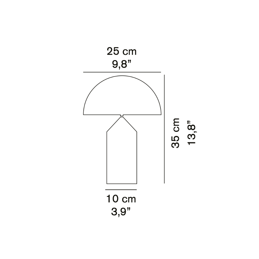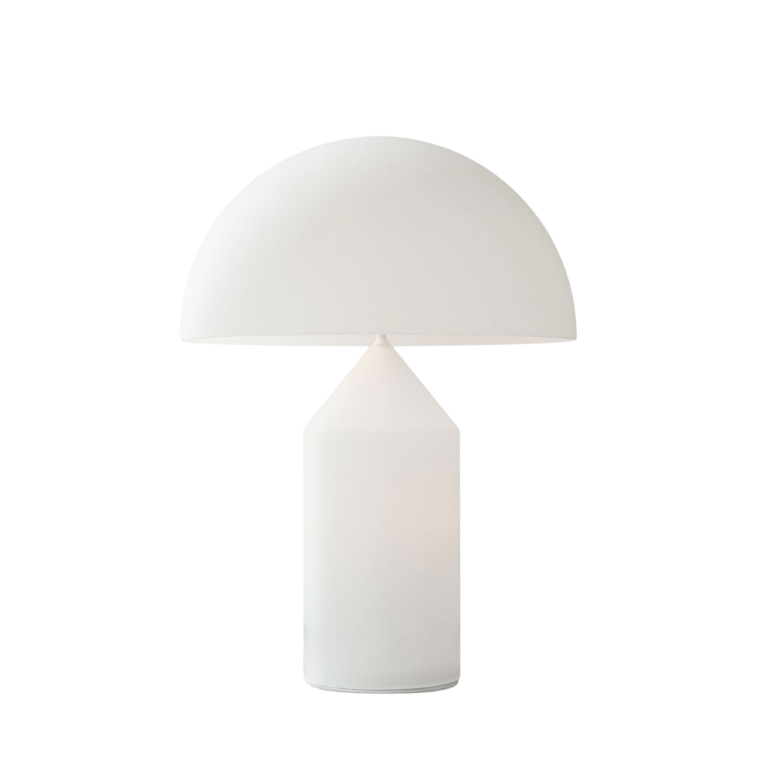 The Atollo S - Cristal lamp is a design by Vico Magistretti for Oluce. It is a table lamp made of opal Murano glass. The Atollo table lamp collection was designed in 1977 and is a design icon for its composition of geometric shapes and the materials used. The lamp is a light sculpture that combines a cone, a cylinder, and a hemisphere. In 1979, it received the Compasso d'Oro award. Today, the Atollo lamp is part of the permanent collections of major design museums.