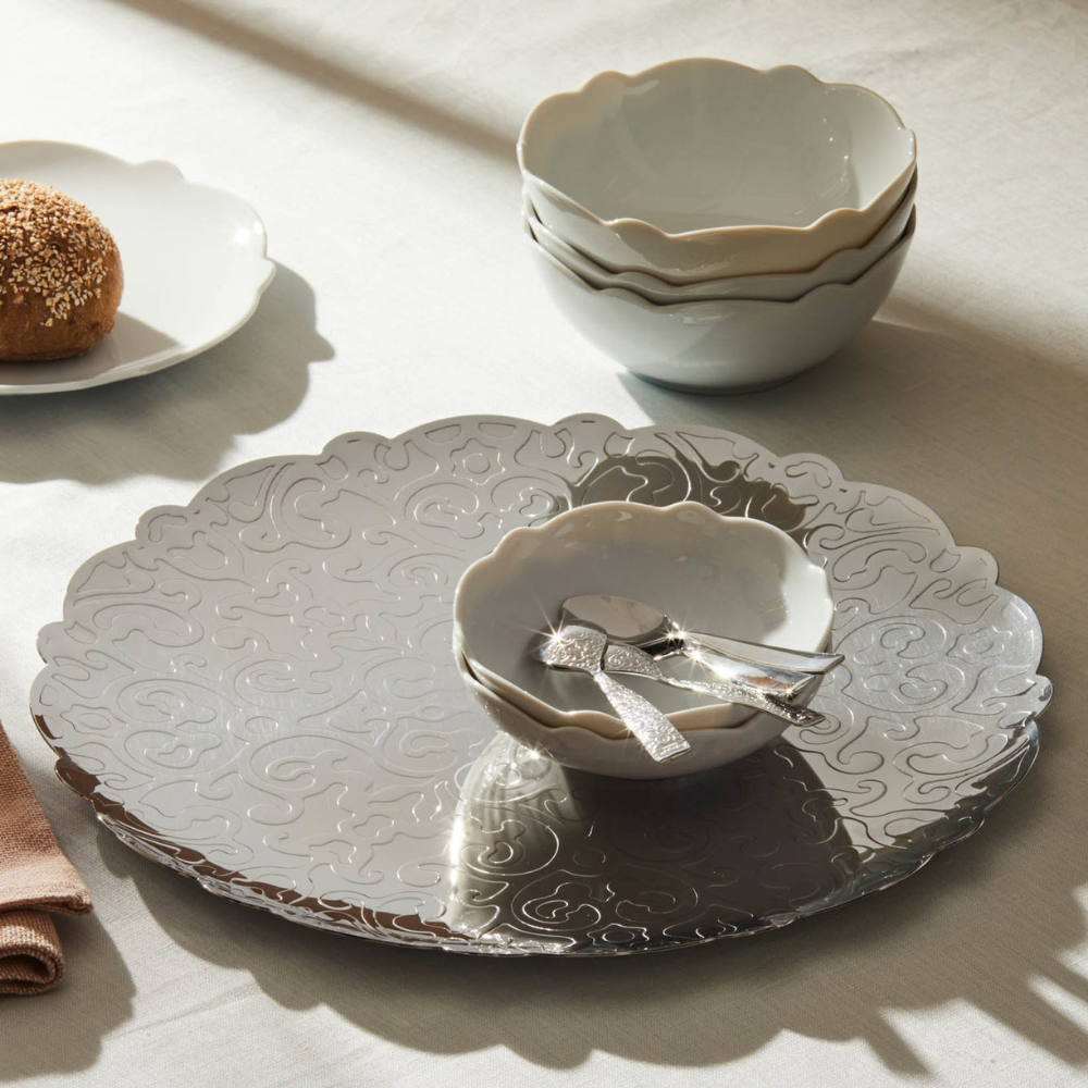 Round steel tray with relief decoration.
