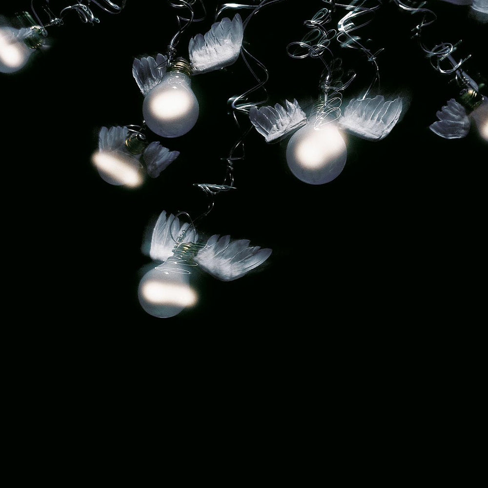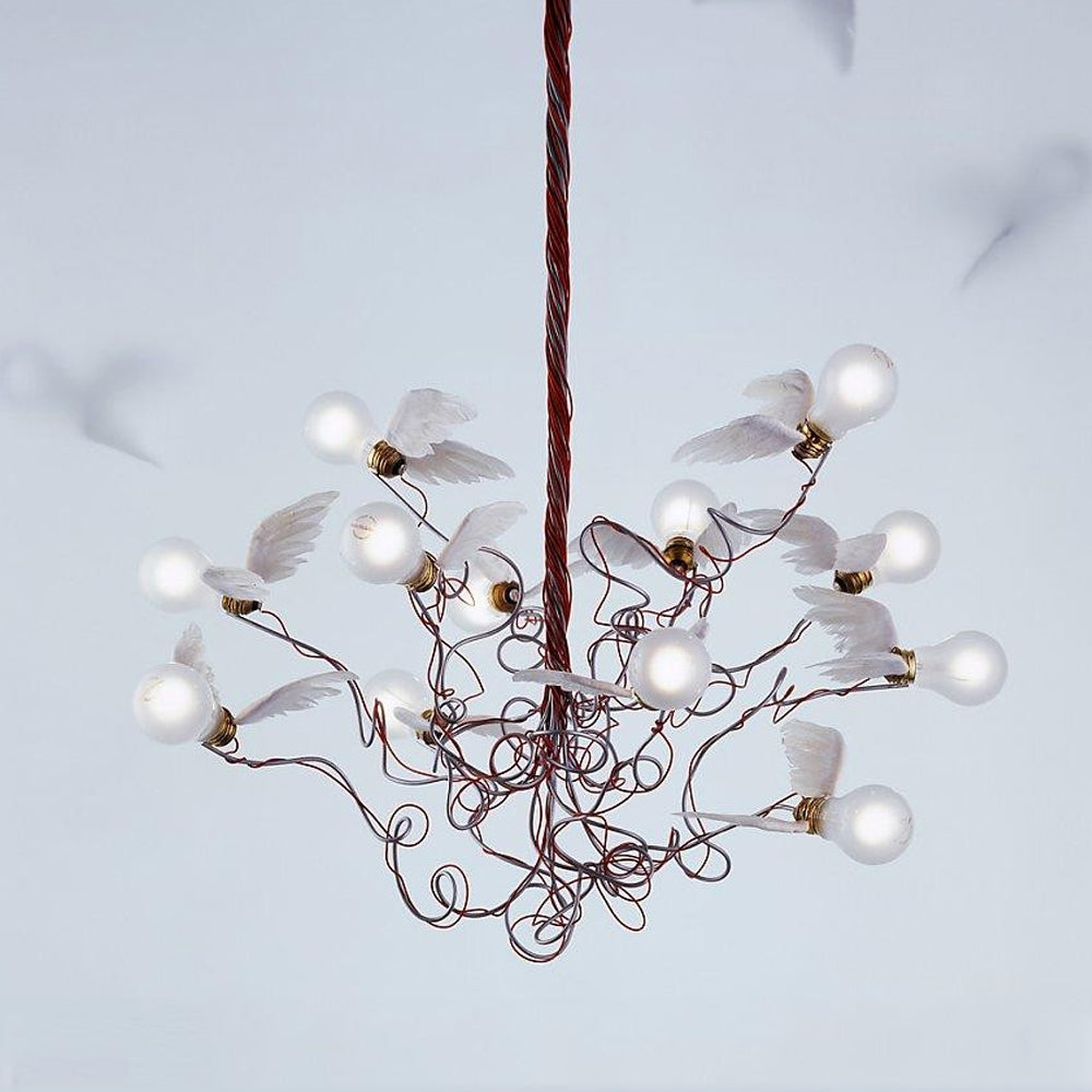 Pendant lamp with a metal frame and red cable, 12 1.5W E-27 LEDs, 12V AC, 1200lm, 2600K CRI95, dimmable, and goose-feather wings. For ceiling heights of 260 cm or more. Includes 12 LEDs. Transformer built into the base.