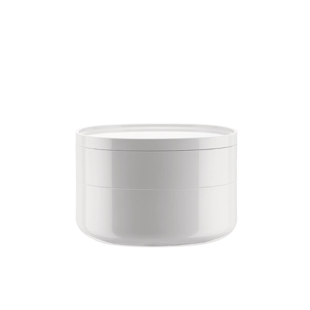 Bathroom container with compartments and lid, made of thick white PMMA with a glossy finish. It can be used in a variety of ways and can hold makeup products, hair accessories, dental hygiene items, and more.