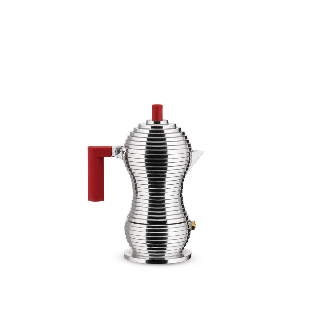 Espresso machine in cast aluminum, handle and knob in red PA.