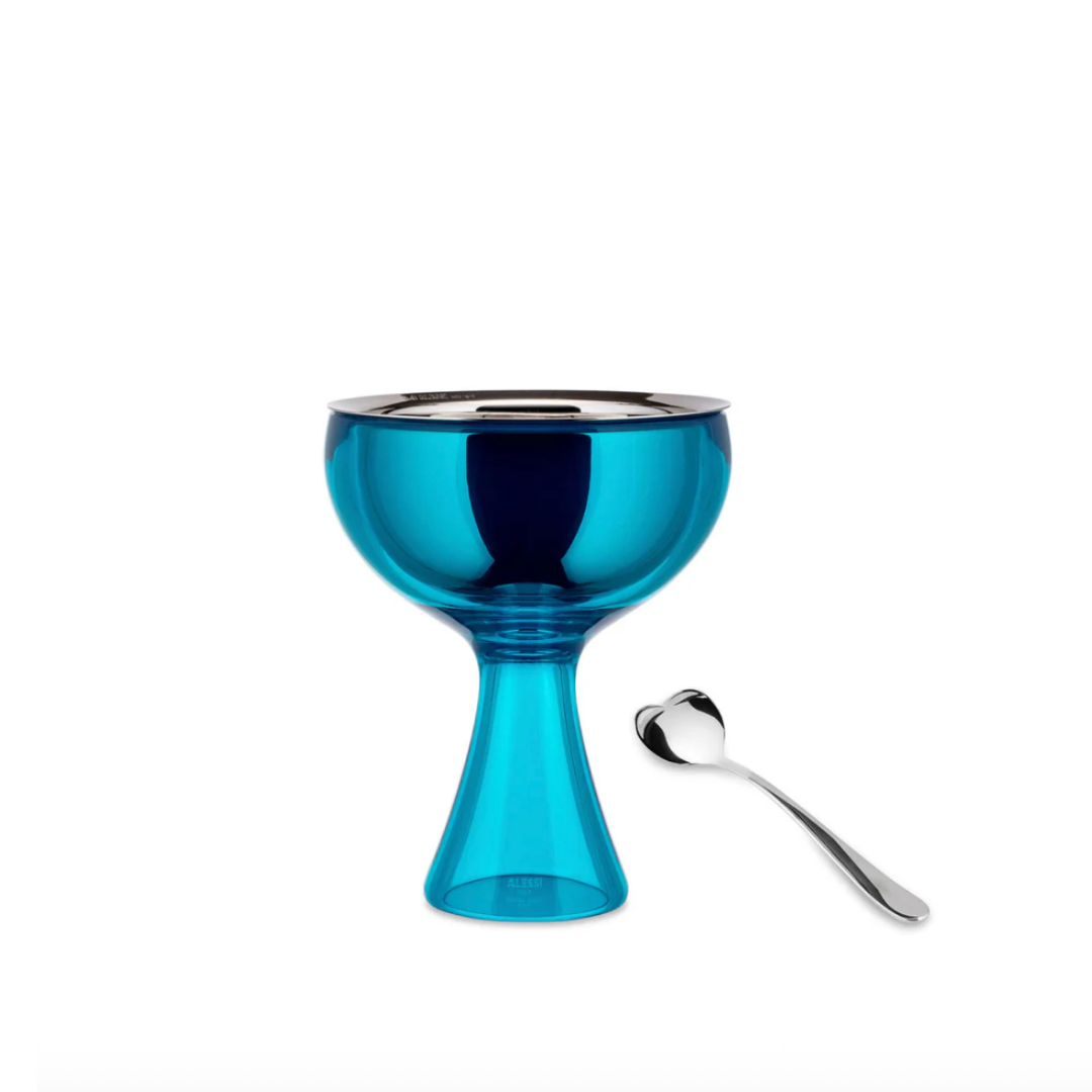 Diseñador: Miriam MirriBig Love es una copa para helado que celebra el postre como un momento compartido. Diseñada por Miriam Mirri, su forma amplia permite servir para uno o dos, y la cuchara en forma de corazón —dividida en dos mitades— refuerza ese gesto simple de comer juntos. El contraste entre el interior de acero pulido y el exterior translúcido le da presencia sin exceso, acompañando la mesa con un guiño sutil y cotidiano.