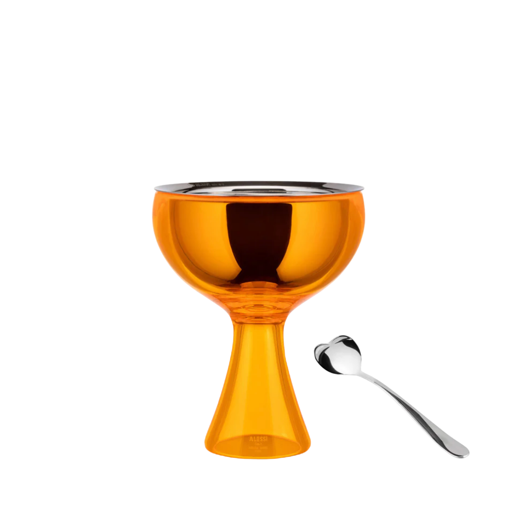 Diseñador: Miriam MirriBig Love es una copa para helado que celebra el postre como un momento compartido. Diseñada por Miriam Mirri, su forma amplia permite servir para uno o dos, y la cuchara en forma de corazón —dividida en dos mitades— refuerza ese gesto simple de comer juntos. El contraste entre el interior de acero pulido y el exterior translúcido le da presencia sin exceso, acompañando la mesa con un guiño sutil y cotidiano.