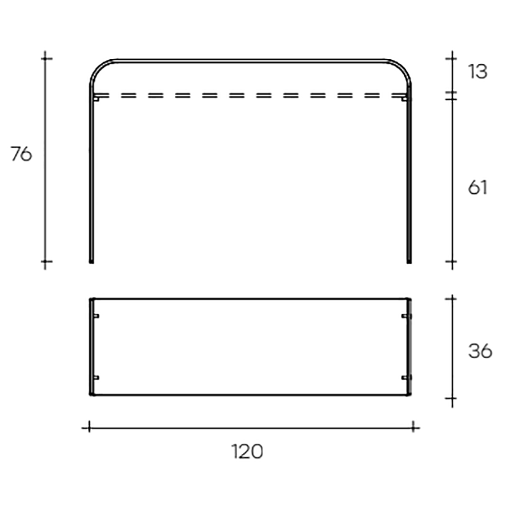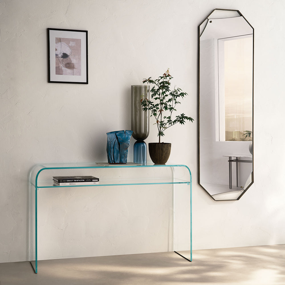 Console with shelf in extra clear curved tempered glass e=12mm.