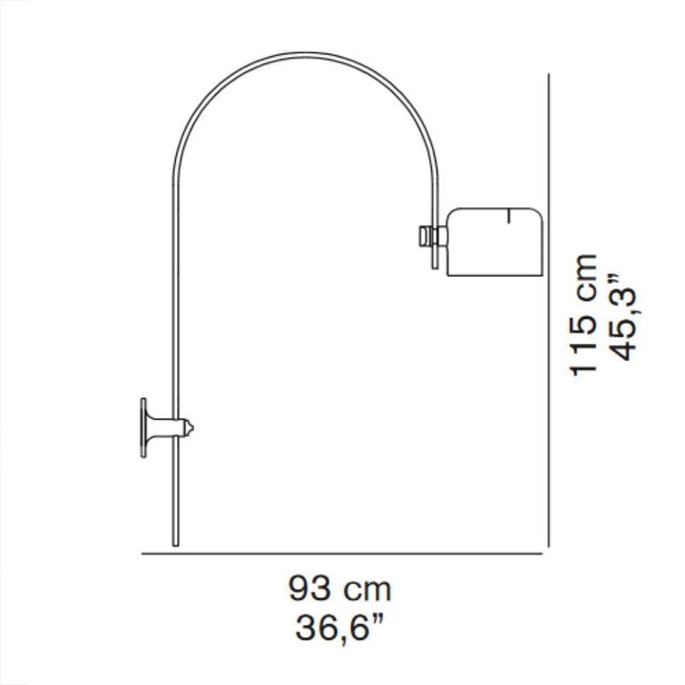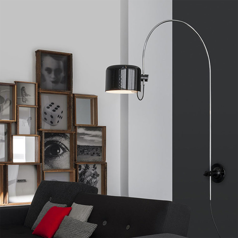 Metal wall light with an adjustable arm, providing direct and reflected light. 13.5W E27 halogen or LED retrofit. Black. Designed by Joe Colombo in 1967.