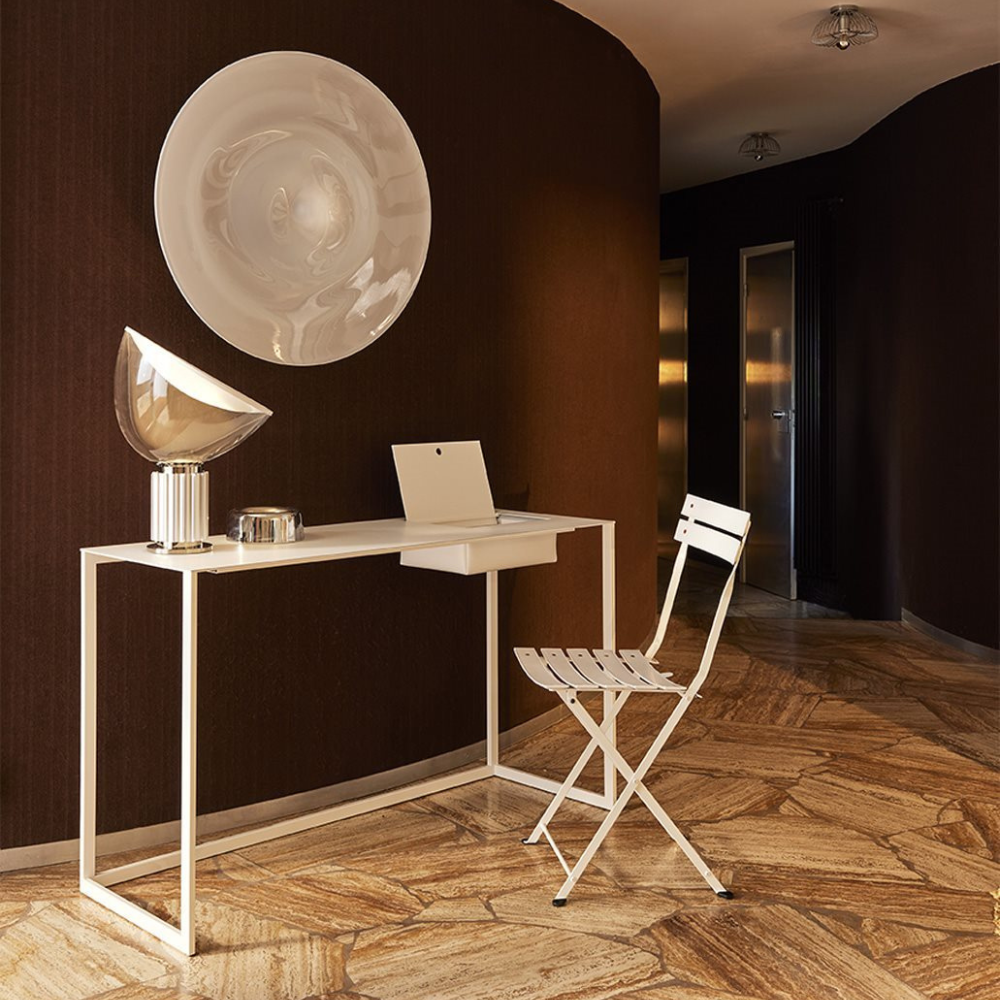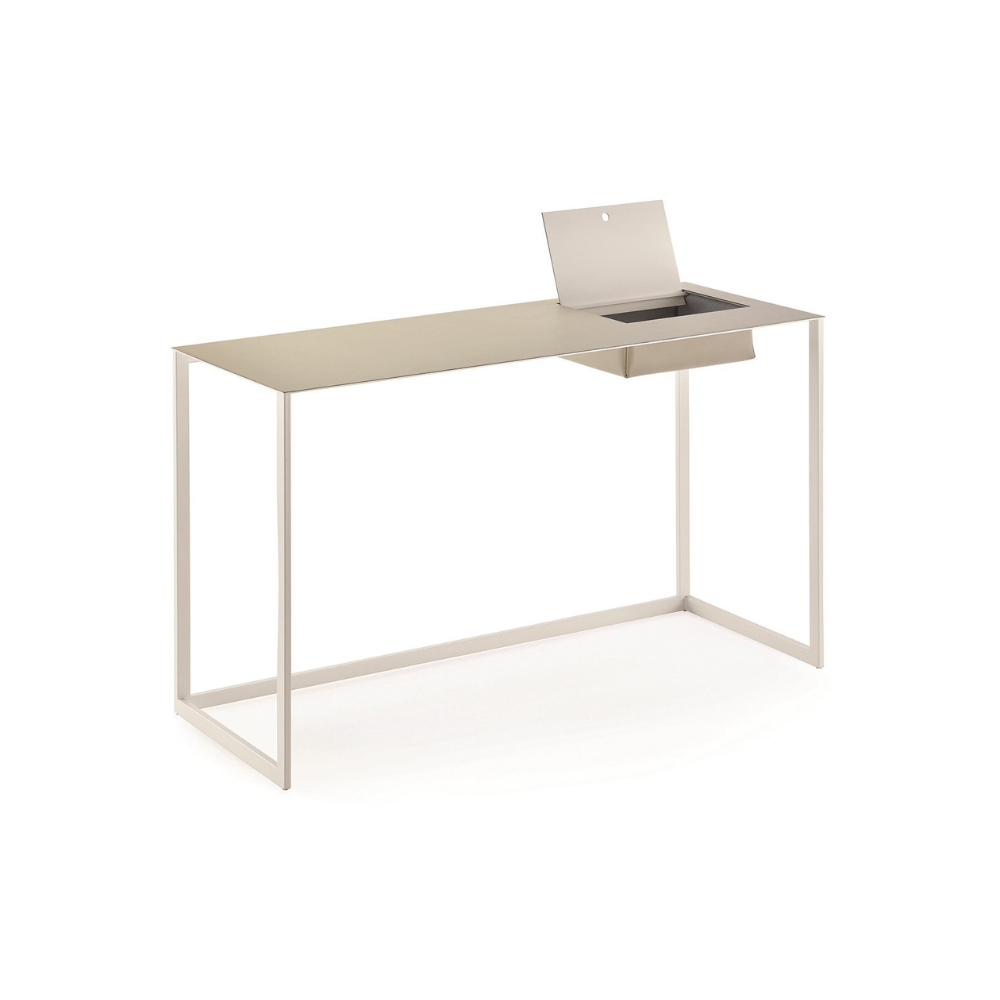 Console/desk with a talc-colored steel frame and light gray pigmented leather cover.