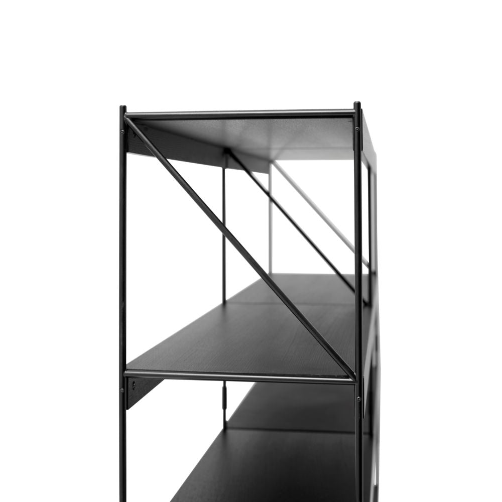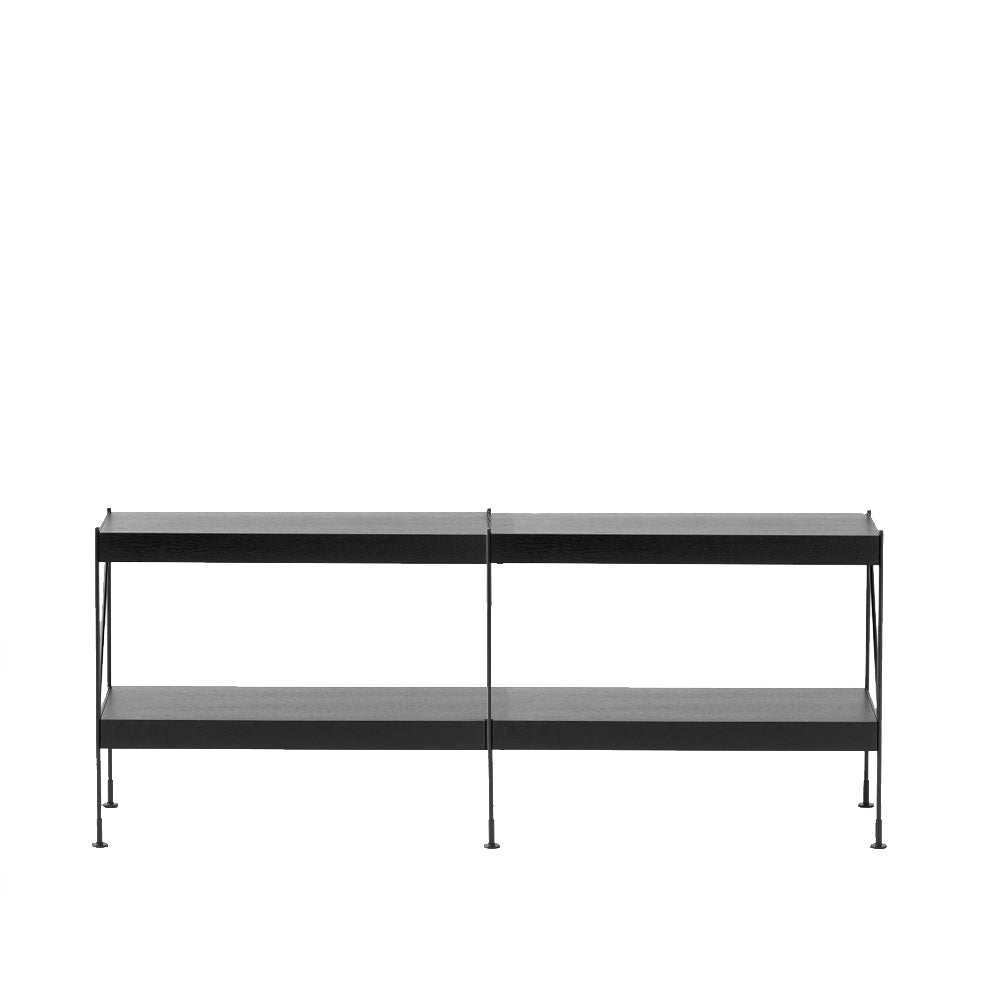 Black steel shelving system with 2 modules and 2 shelves in black oak veneered MDF.