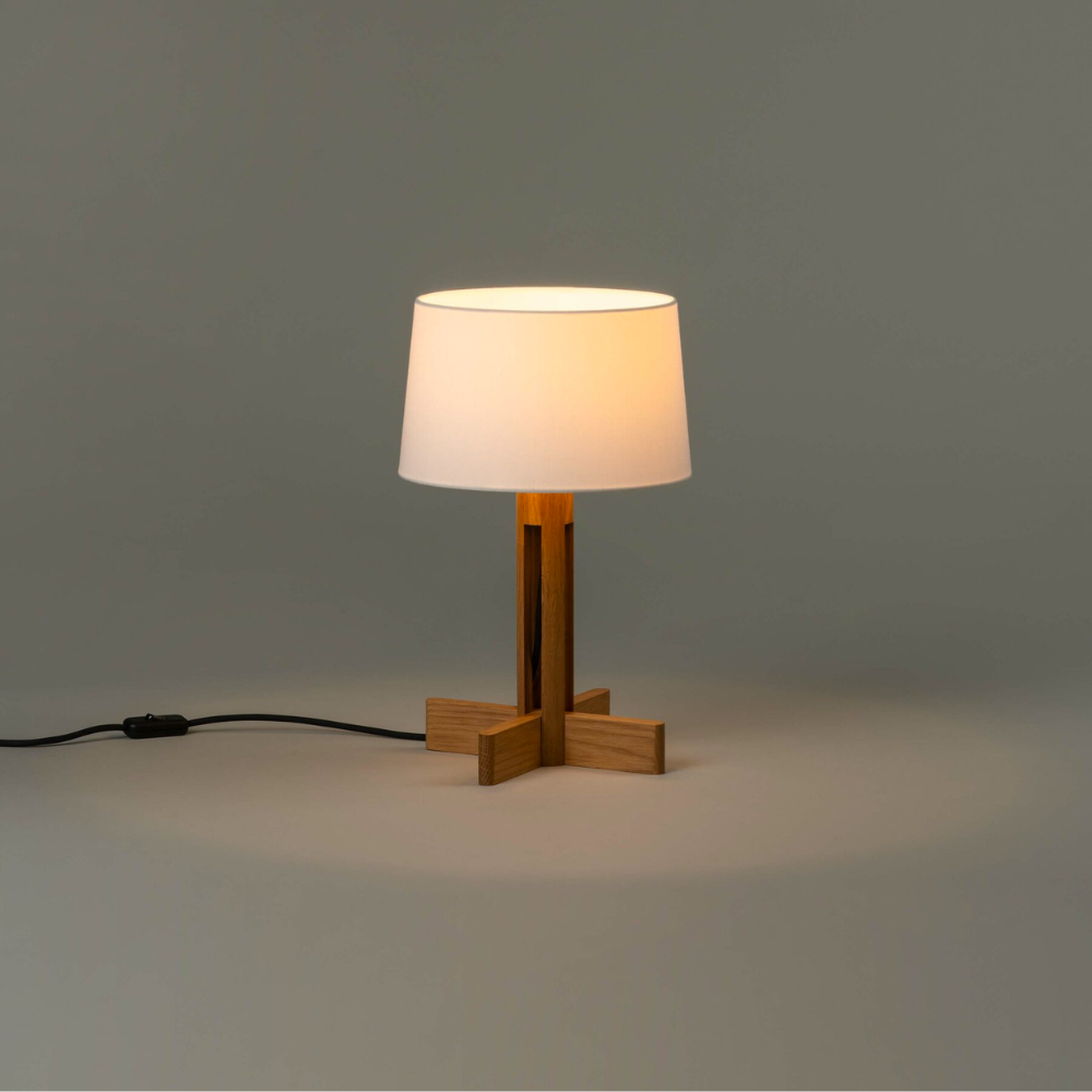 Miguel Milá achieves a successful composition with this demonstration of industrial craftsmanship. A cylindrical oak column creates a symmetrical verticality and provides support for an almost cylindrical white linen shade. Without giving in to unnecessary embellishment, FAD lamps are distinguished by their enduring elegance.