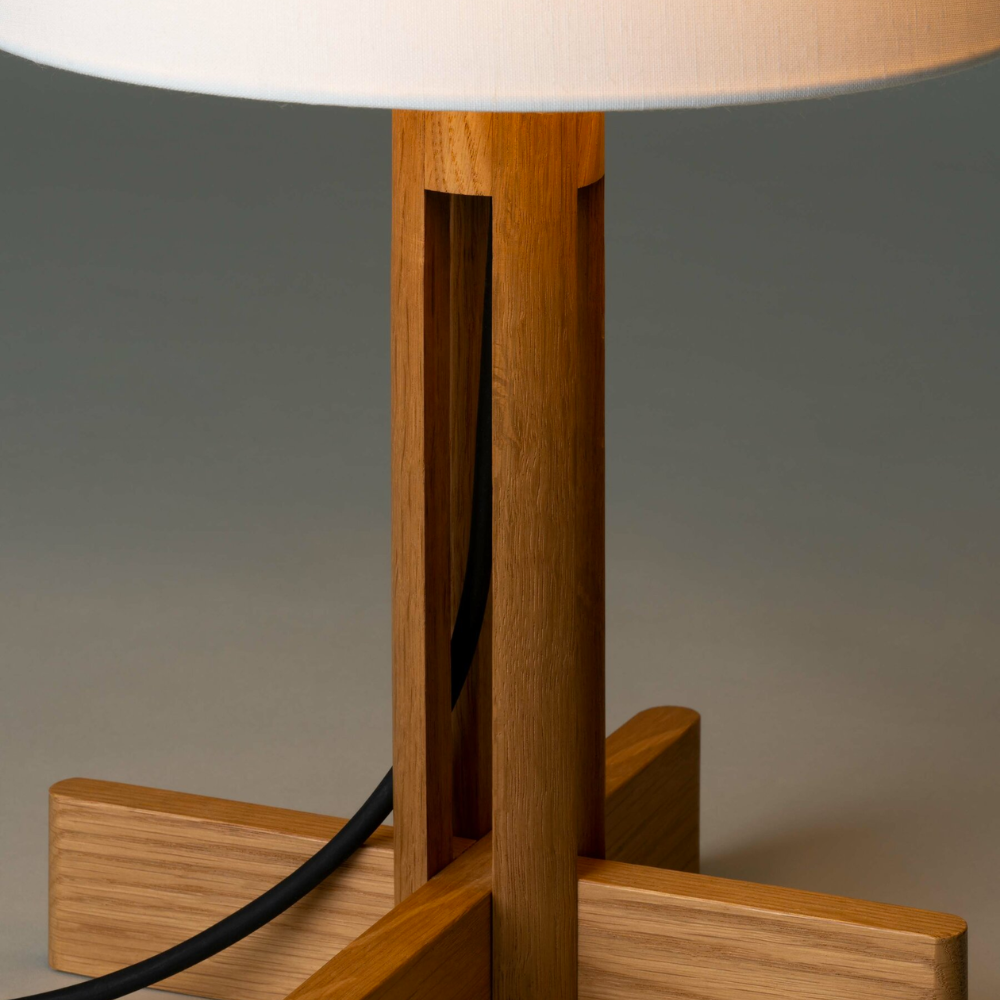 Table lamp with a natural oak wood frame and white linen shade. 9W maximum E-27 retrofit LED, not included. Designed by Miguel Milá, 1973.