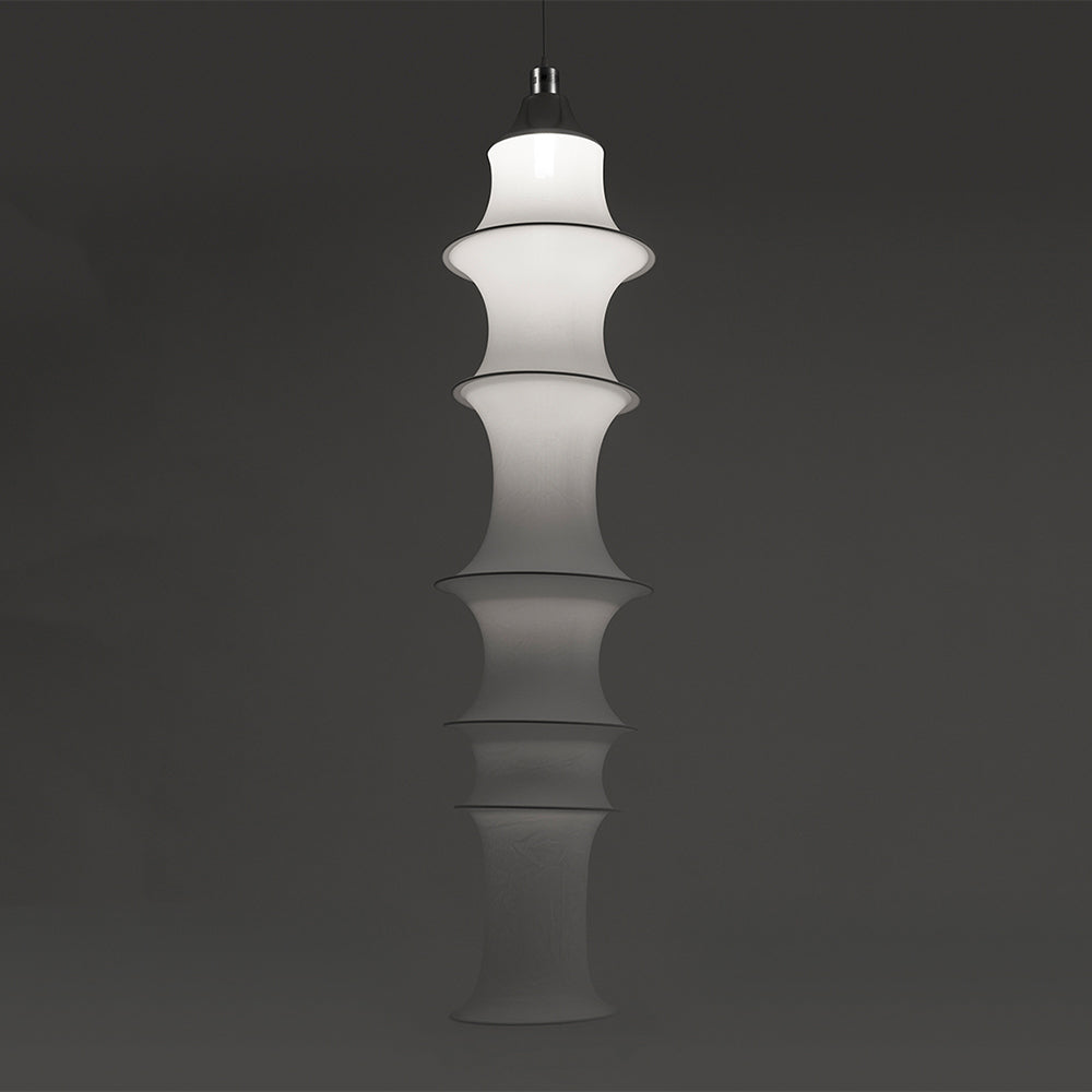 Its design is based on a series of aluminum rings of varying diameters, suspended within an elastic textile mesh that shapes them as they extend, generating an undulating, organic volume. The combination of these elements creates a lamp that appears to float in space, projecting a warm, diffuse light ideal for hallways, living rooms, or any setting seeking a touch of minimalist elegance.