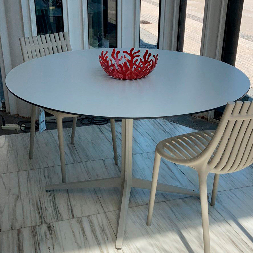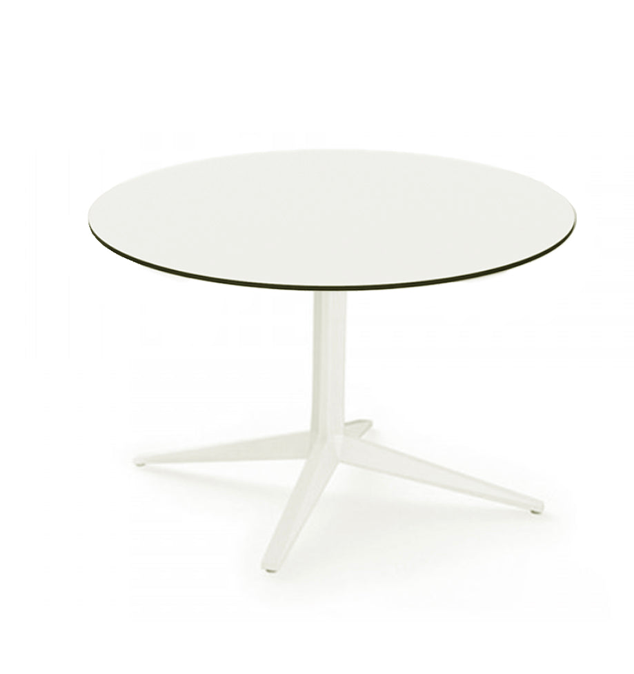 Table with epoxy-coated aluminum base, fixed support in polyamide with fiberglass and HPL cover, Ø 120 cm, ecru color. H73 cm.