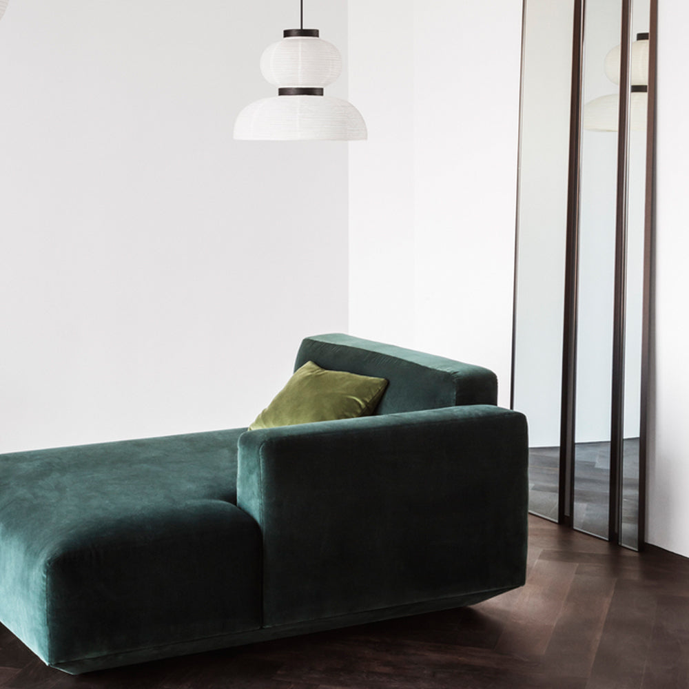 A tribute to Asian design through the lens of Scandinavian minimalism, the beauty of the Formakami pendants lies in the delicacy of their materials. Designed by Jaime Hayón and handcrafted from paper, their light, bulbous shapes are enhanced by the contrasting presence of black-stained oak, creating a striking visual composition that is reflected throughout the series.