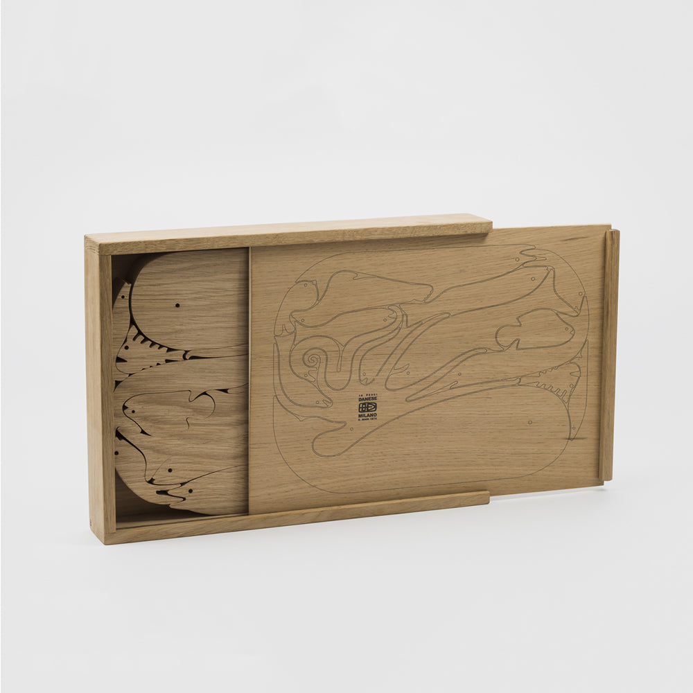 The 16-Fish Wooden Puzzle is an oak wood puzzle designed by Enzo Mari in 1973. The game consists of 16 fish figures that fit together like a puzzle. The game comes in a wooden box and is considered a small sculpture for the home.