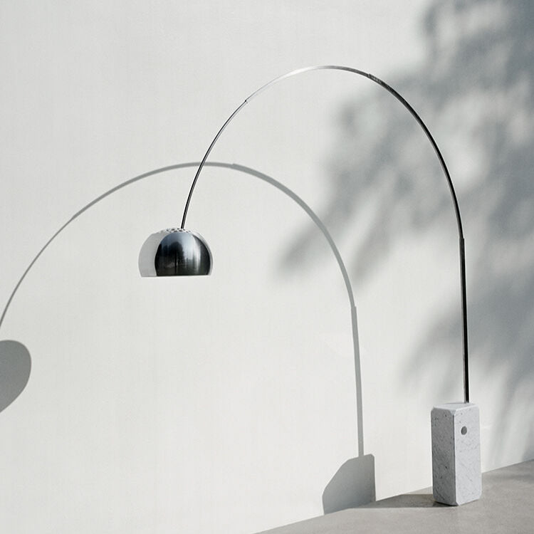 Floor lamp. One of the most recognizable objects of all time, Arco features a parallelepiped marble base that counterpoints the iconic arched metal stem. 70W E-27 halogen or 11W E-27 LED retrofit, not included, with integrated dimmer. Designed by Achille and Pier Giacomo Castiglioni, 1962.