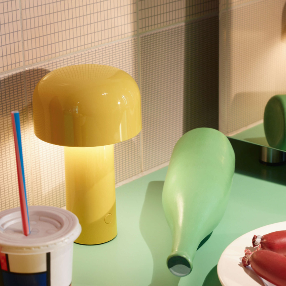 Rechargeable table lamp with direct light. Base and diffuser made of colored polycarbonate. Injection-molded photo-etched opal polycarbonate diffuser. Up to 24 hours of battery life and recharging via Micro-USB-C. A push-button switch located on the base provides 4-step dimming. The battery status indicator is located under the base. A USB-C charging cable is included in the package and is 120 cm long. Power: 2.5W. 2700K. Suitable for dry, indoor spaces.