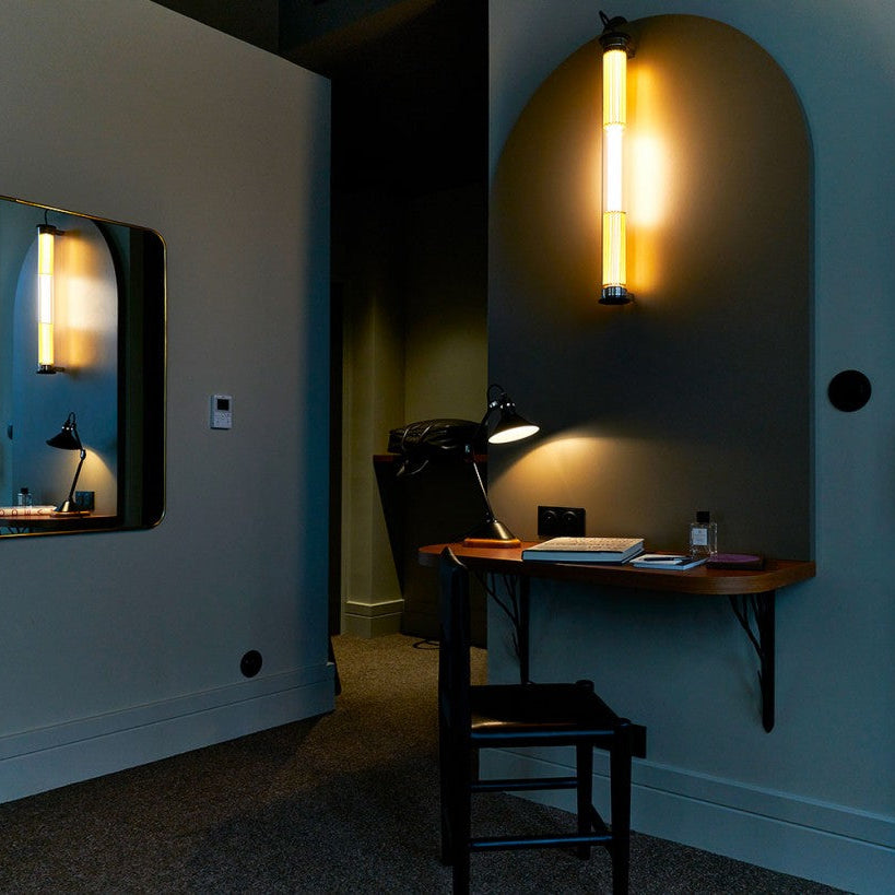 Su estructura tubular de vidrio de borosilicato encierra una fuente de luz lineal que emite una iluminación de 360°, contenida y cálida, reflejada sobre la malla metálica interior en terminación dorada. Los detalles constructivos —collares ajustables en acero inoxidable, tapones de aluminio fundido y sellos de silicona negra— combinan precisión técnica y elegancia discreta. Puede instalarse de manera horizontal o vertical, proyectando haces de luz suaves y envolventes.