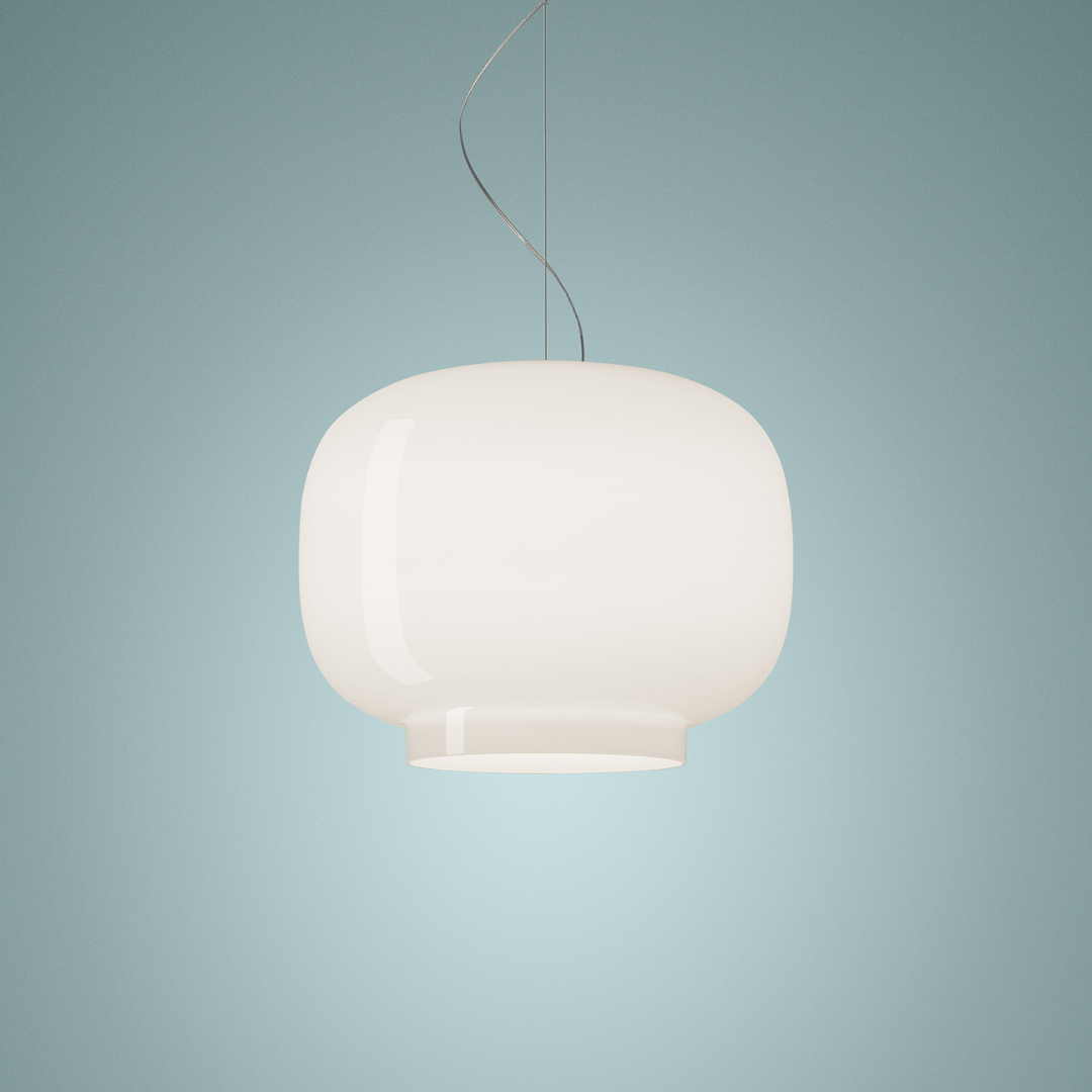 Su cuerpo en cristal soplado lacado blanco difunde la luz de manera uniforme, proyectando una iluminación cálida y envolvente. La forma compacta y ligeramente orgánica mantiene el carácter icónico de la colección en una lectura más neutra y arquitectónica.