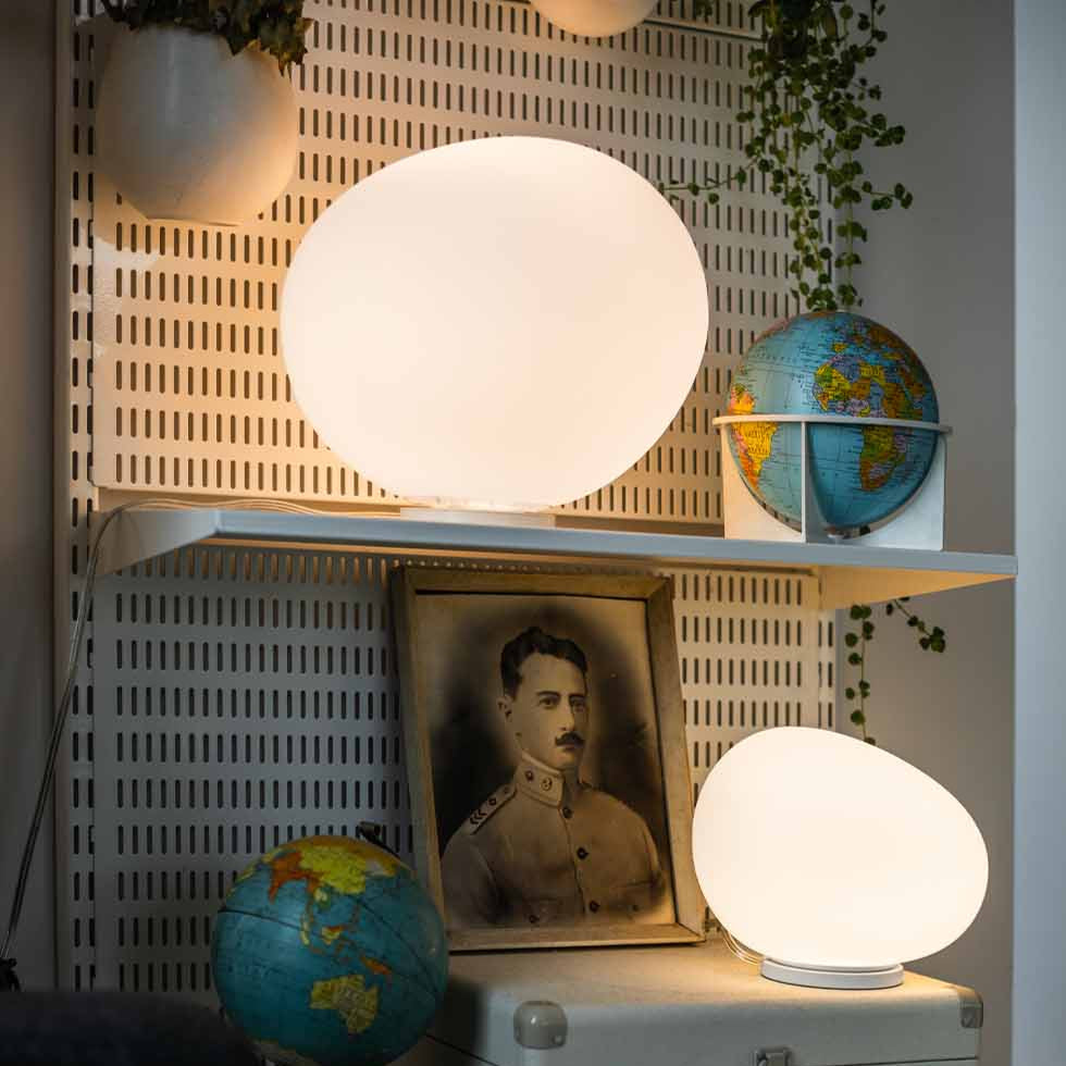 Designed by Ludovica and Roberto Palomba, the Gregg table lamp features an organic shape reminiscent of a water-polished pebble. Crafted from mouth-blown glass, this lamp emits a warm, even light that creates a welcoming atmosphere in any space.