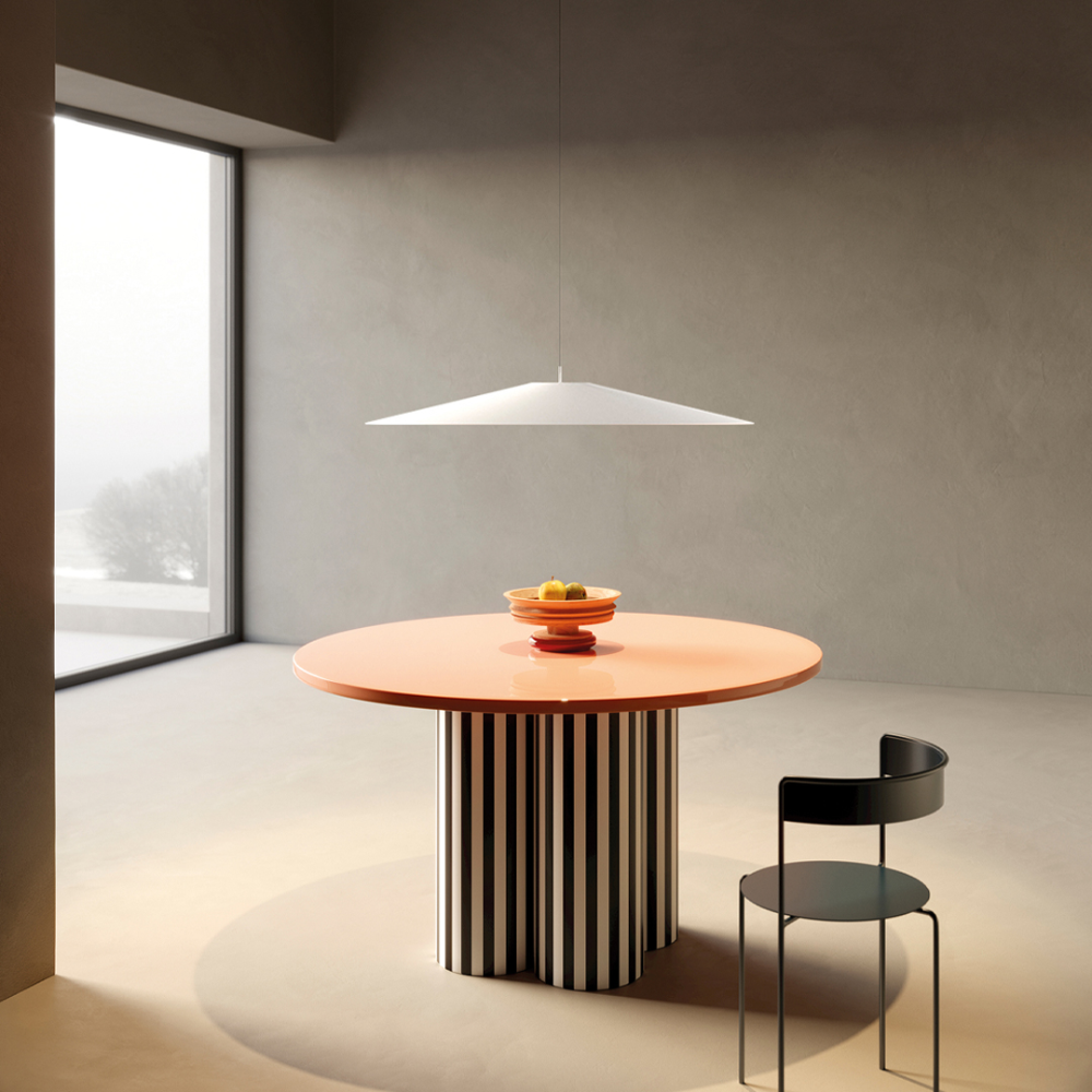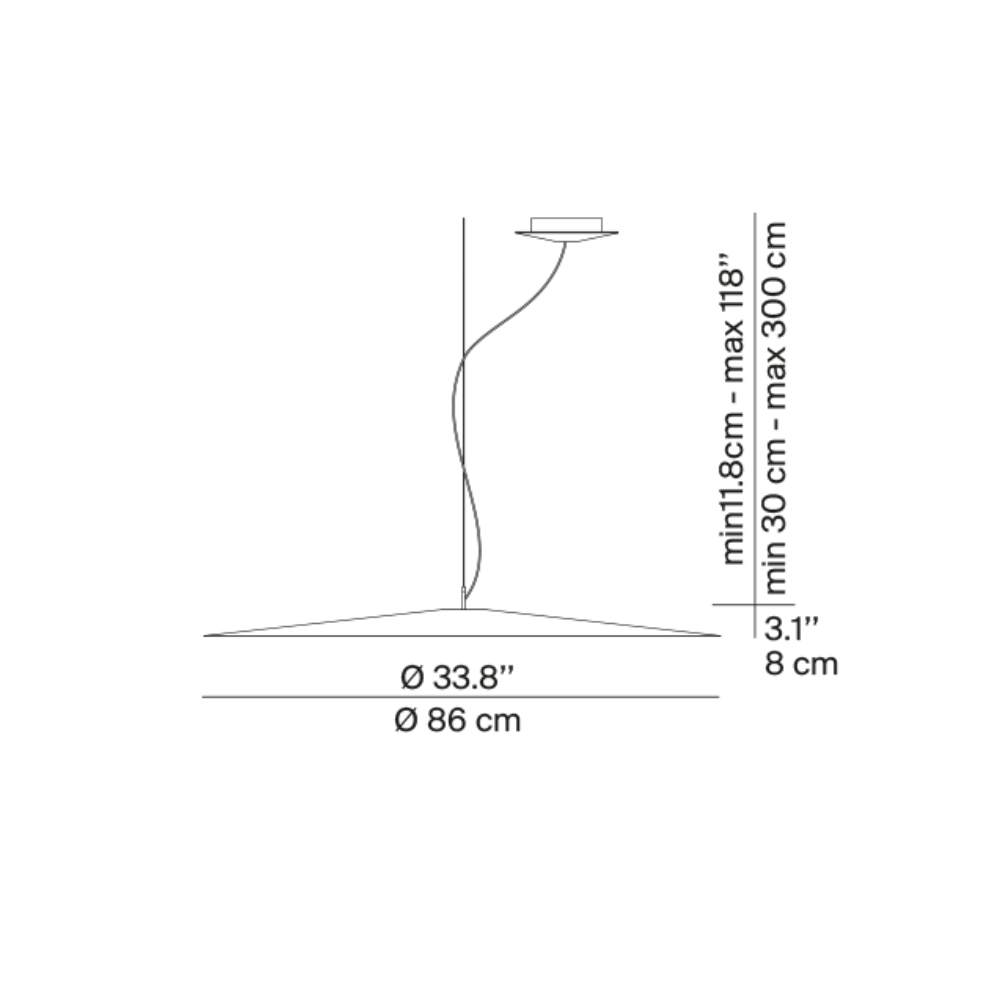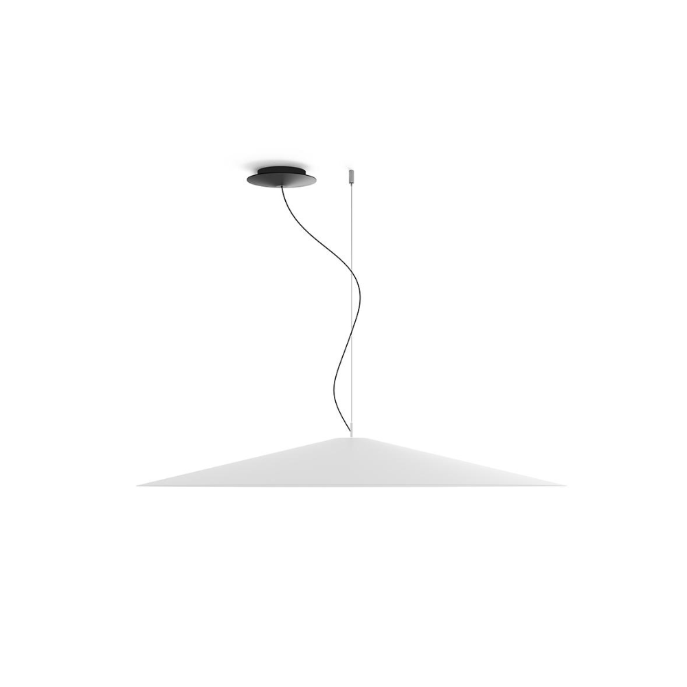 86 cm diameter suspension lamp, aluminium structure and glass lens, 26W 1830lm 2700K LED, with black rosette and dimmable phase-cut driver, matte white.