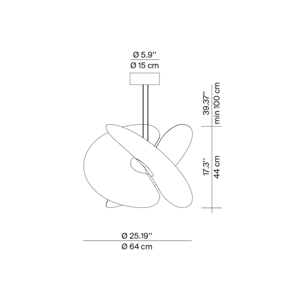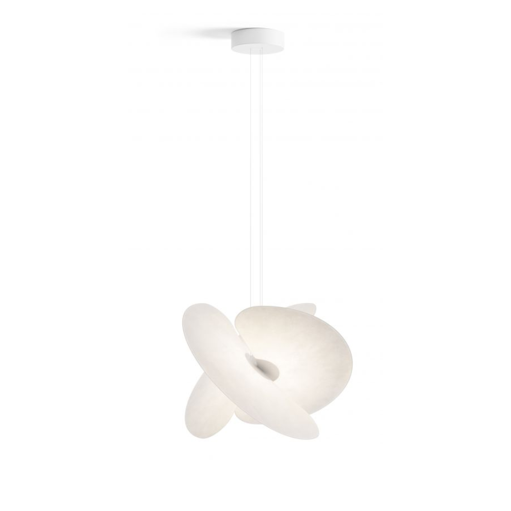 Suspension lamp with a diameter of 64 cm, dimmable phase cut, includes a 28W 1230lm 2700K CRI90 module with 3 small white diffusers.