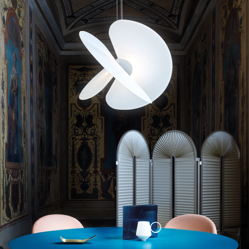 Levante is a visually striking pendant lamp. It consists of the intersection of three large wings, made of a material unusual for the design sector—it comes from the food industry—reminiscent of rice paper and diffuses light evenly throughout the space. The delicate wings are magnetically attached to the central section containing the bulb, hidden like a real beating heart.