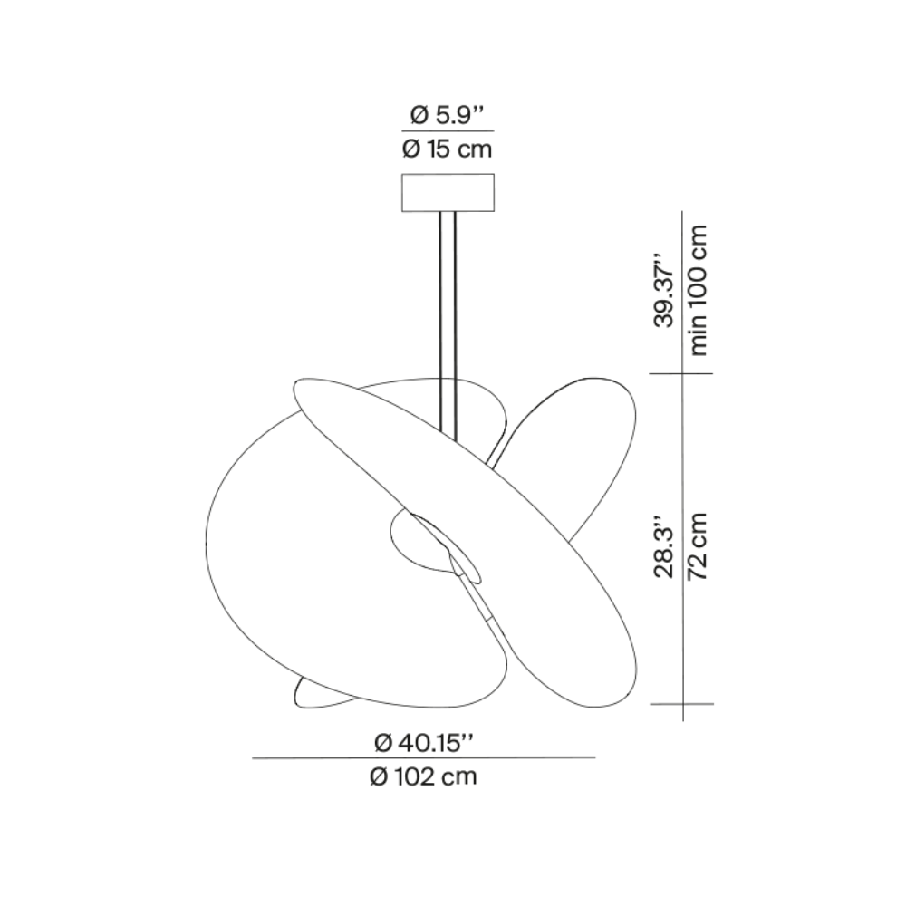 Suspension lamp with a diameter of 102 cm, dimmable phase cut, includes a 54W 2460lm 2700K CRI90 module with 3 large white diffusers.