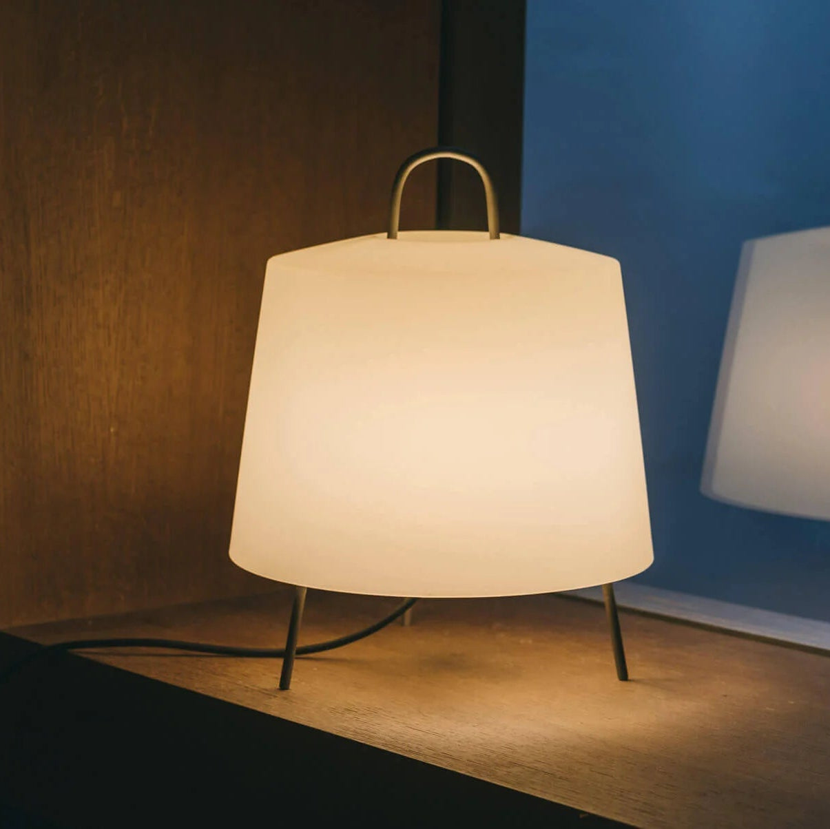 A nomadic lamp, designed and developed for Kettal. The lamp is built around a glass diffuser, protected by a large polypropylene shade. Both elements are supported by an ingenious wire structure.