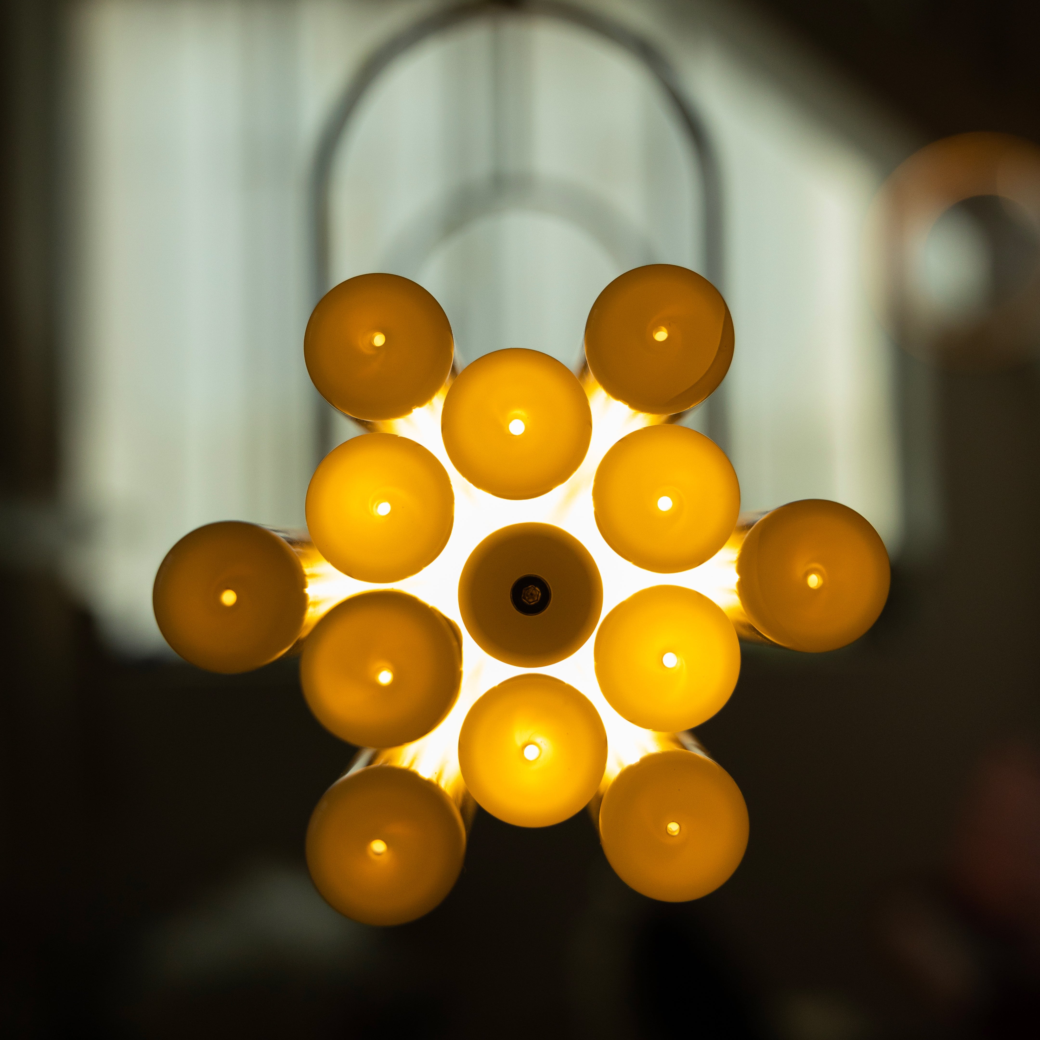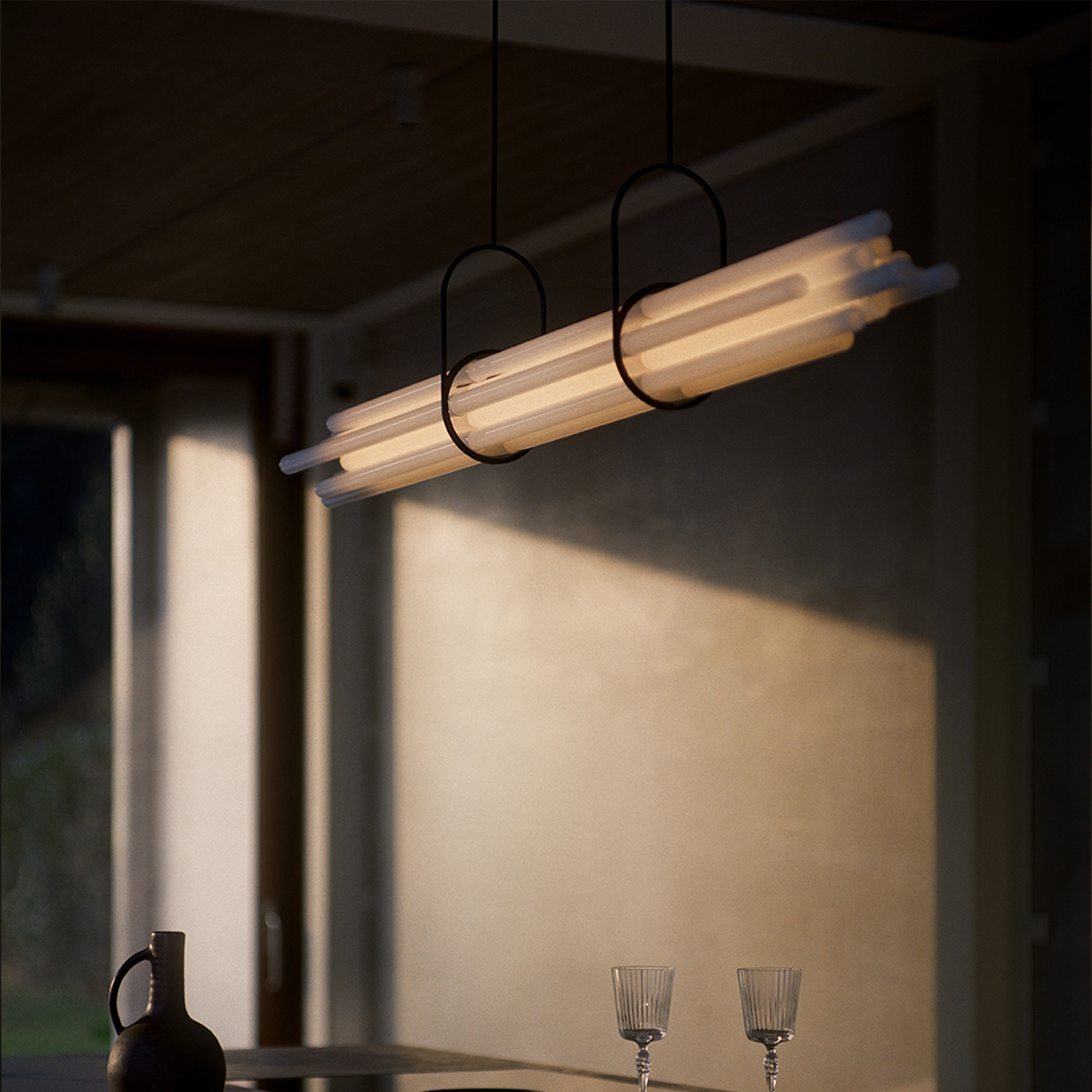 Solo uno de estos tubos actúa como fuente de luz central, mientras los demás difunden su resplandor mediante refracción y prisma, logrando un efecto luminoso uniforme y envolvente. Sin cables visibles, sin LEDs a la vista y sin estructura aparente, la NL12 evoca una suspensión etérea, casi ingrávida. El sistema de sujeción —dos abrazaderas inspiradas en pinzas de gimnasia— añade un gesto artesanal e industrial que refleja el dominio técnico de su creador.