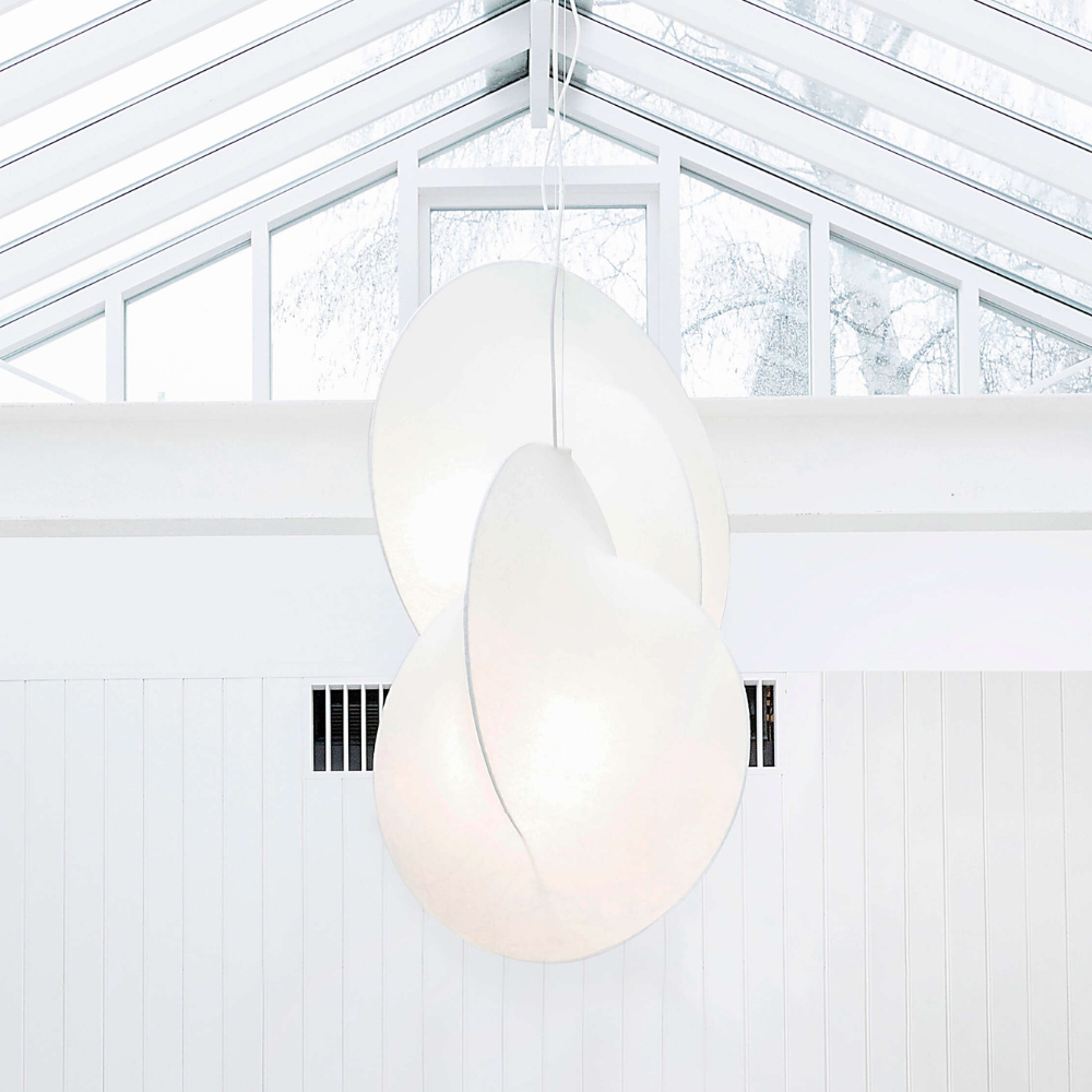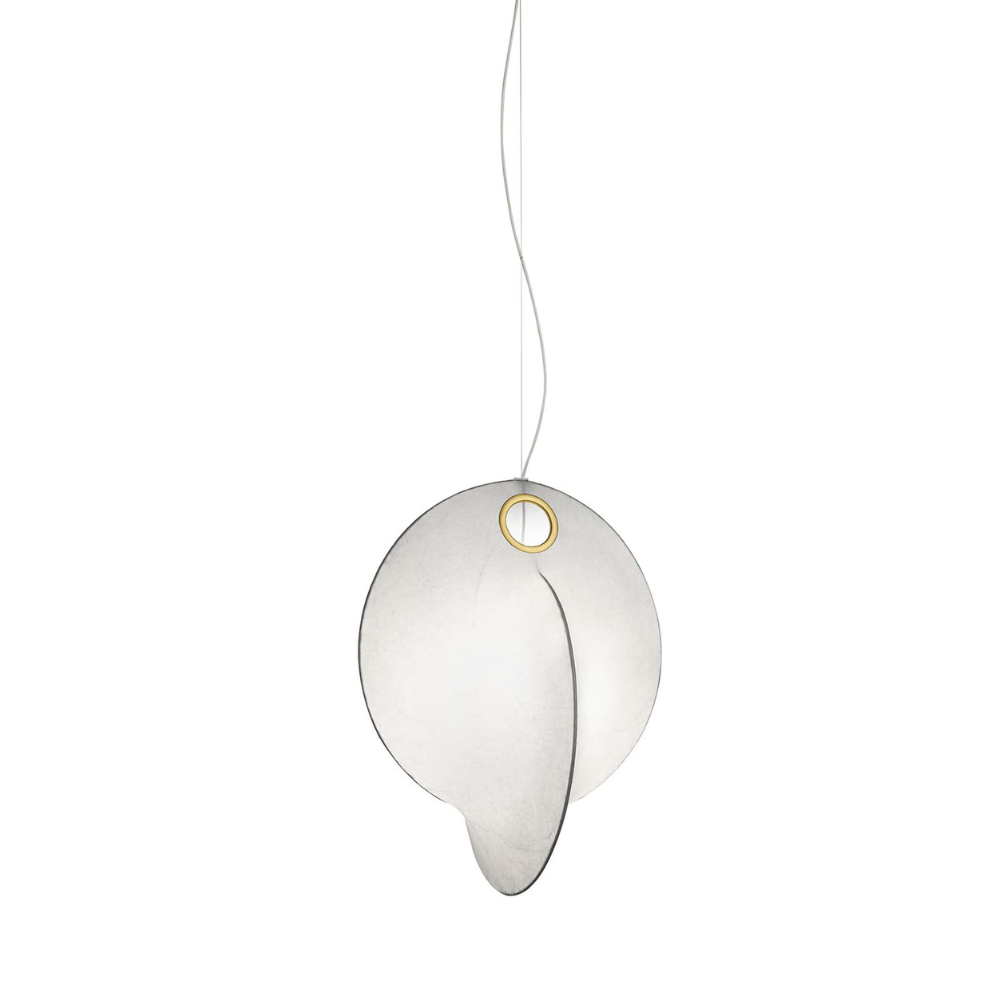 Diffused light pendant lamp. Internal structure made of white powder-coated steel. Cocoon resin diffuser on the structure, with transparent protection sprayed on at the end of the process. Ring for replacing the light source stamped in steel, with a polished and galvanized gold finish. Cast Zamak rosette with a polished and galvanized gold finish.