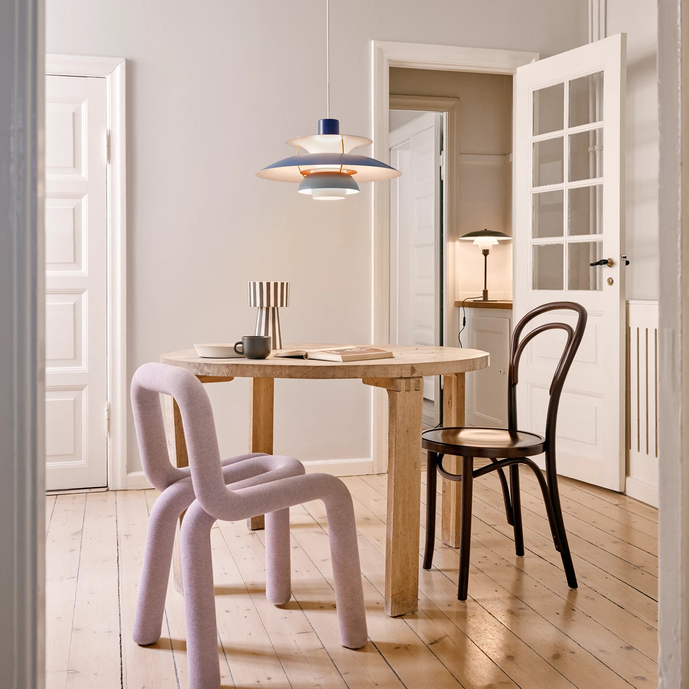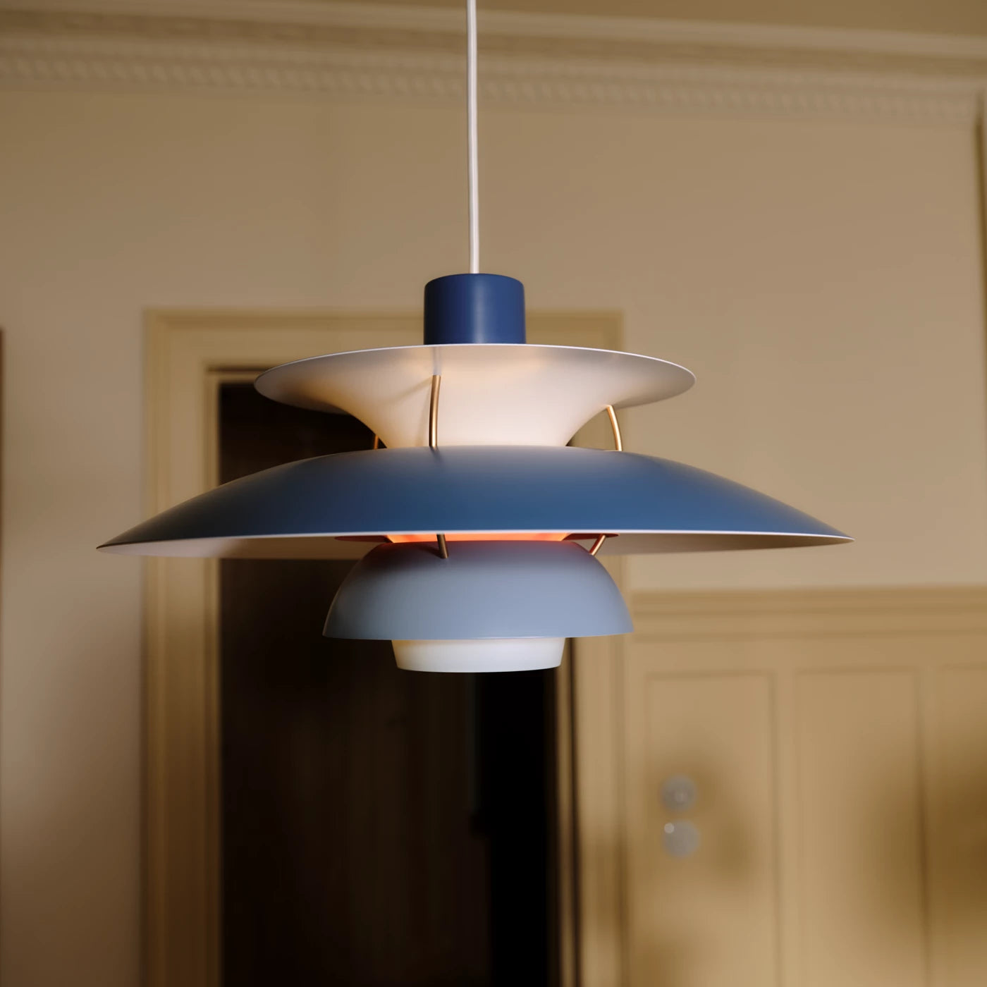 El diseño piramidal proyecta luz descendente y lateral, iluminando incluso su propia forma. Desde su lanzamiento, la PH 5 se convirtió en un clásico presente en hogares y espacios públicos de todo Dinamarca. La versión Hues of Blue presenta un acabado mate en tonos azules que crea un efecto de gradiente sutil, complementado con interior blanco para una luz más cálida y un difusor rojo que suaviza aún más la emisión lumínica.