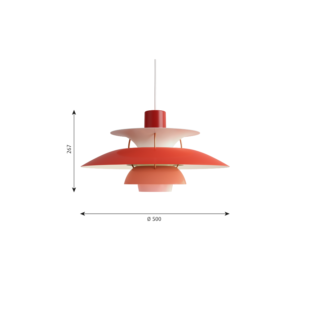 This luminaire provides comfortable, glare-free lighting thanks to Poul Henningsen's three-shade reflector system, which directs the majority of the light downwards. When illuminated, it emits a lateral light, creating a soft glow from within. In addition, the lower shade is fitted with a frosted glass diffuser, ensuring that the light emitted downwards is completely glare-free.
