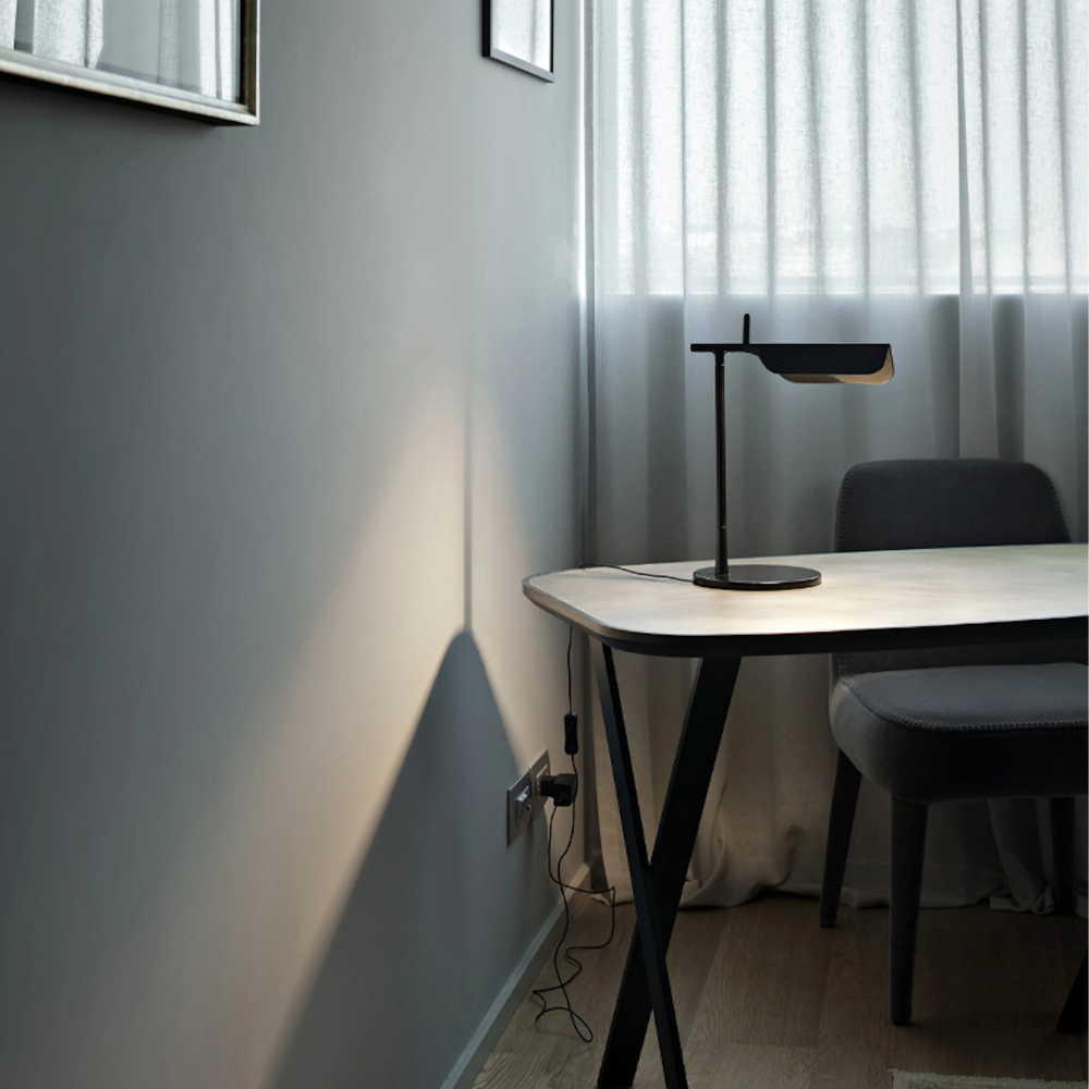 Table lamp. Painted die-cast aluminum body. Multiple LED panel with PMMA diffuser specially designed to prevent the Multi Shadow effect and glare. ±90° head rotation.