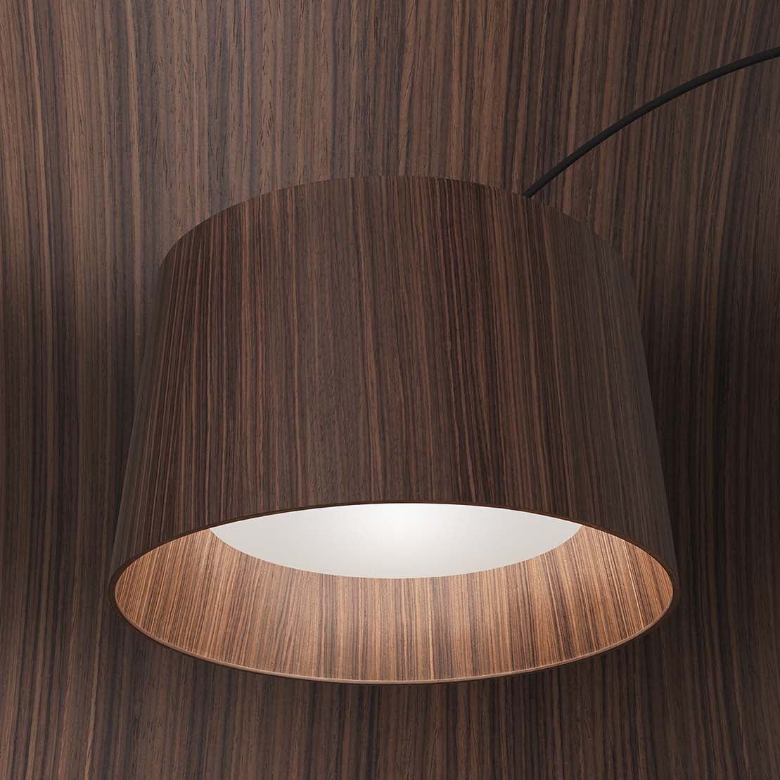 Su estructura arqueada en fibra de vidrio lacada en negro mantiene la ligereza y el equilibrio característicos de la colección Twiggy, mientras el difusor en madera color palo de rosa introduce una dimensión más sensorial y sofisticada.