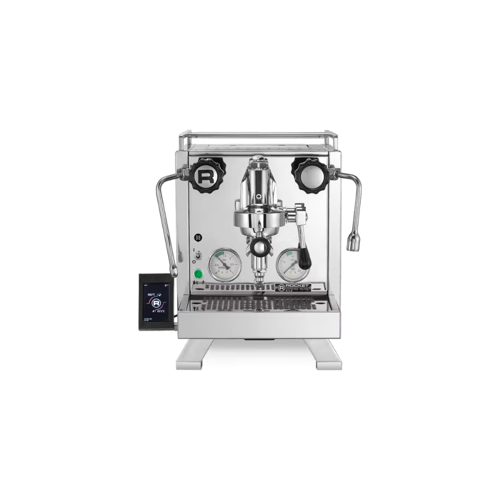 Cinquantotto translates as 58, the new R 58 from Rocket Espresso. Dual PID-controlled boilers operate independently, allowing for optimal extraction of any coffee type or roast style. Rocket Espresso's tilted boiler technology means precise group temperature adjustment and unprecedented levels of temperature stability. The commercial-grade rotary pump draws water from the machine's internal reservoir or allows the machine to have a direct water connection from the water supply. The machine's functions are controlled using the touchscreen communication module, which now includes an auto-on/off feature: your machine is ready to go whenever you need coffee. The communication module can be easily removed from the machine to retain the Rocket Espresso aesthetic.