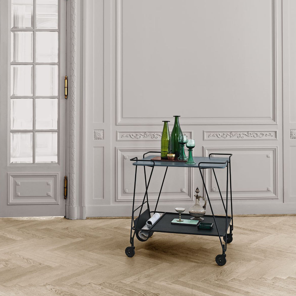 Rolling cart with two trays in black perforated steel. The lower level includes a newspaper rack. Dimensions: 57.5 x 72 x 70.5H.