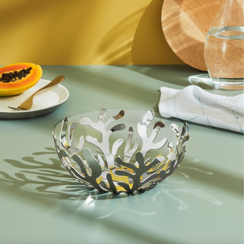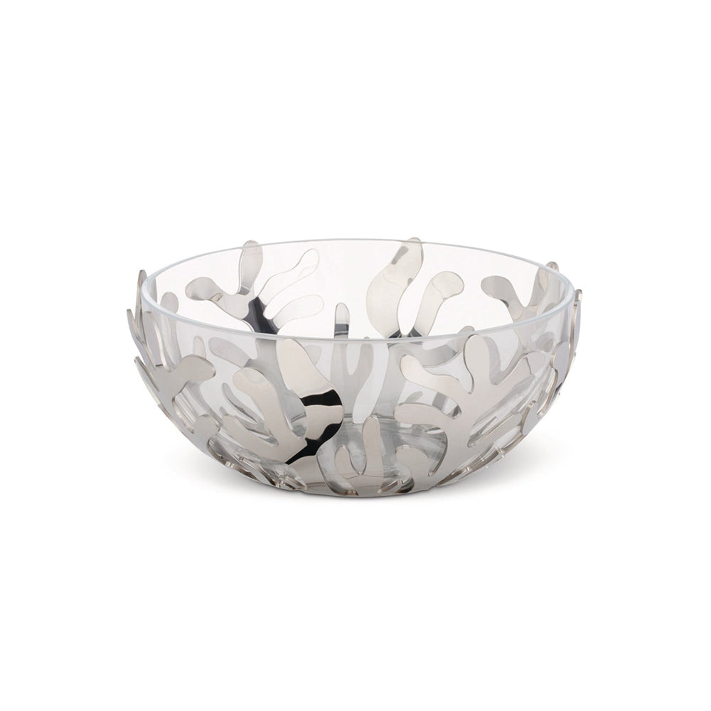 Polished 18/10 stainless steel salad bowl and thermoplastic resin bowl.