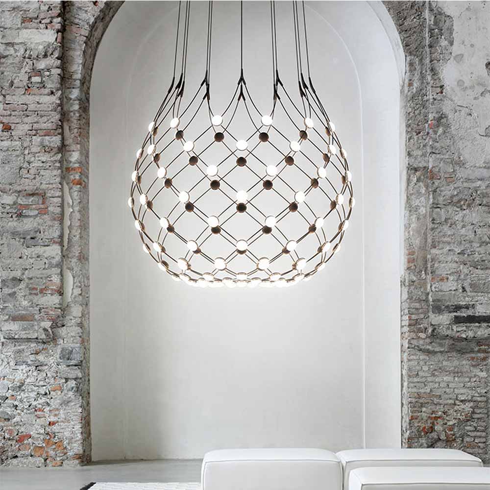 A suspension lamp with a high theatrical impact, its almost transparent structure, composed of a network of flexible cables, 64W 2700K 3252lm LED, dimmable with phase cut, height 90cm and diameter 100cm. 200cm suspension cable.