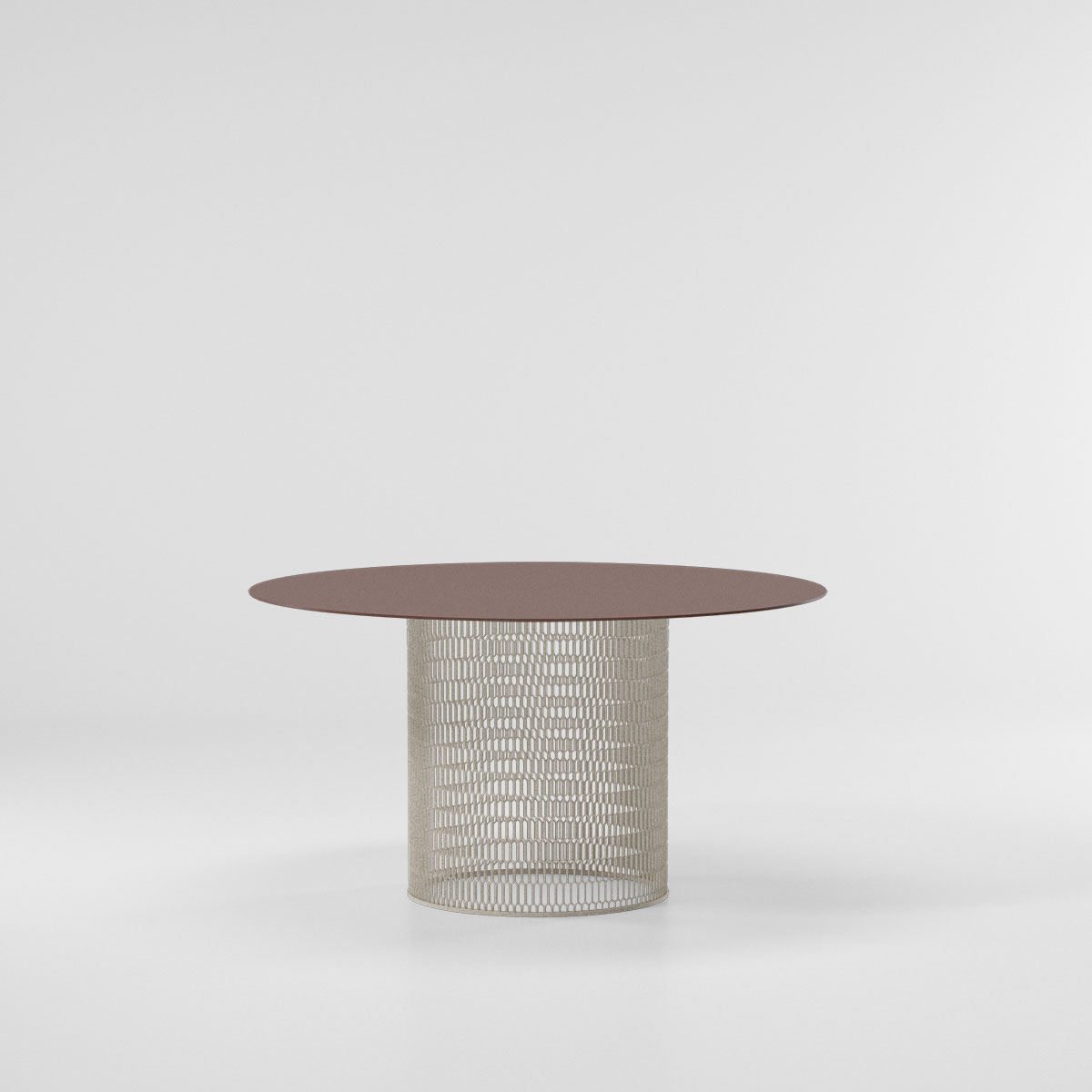 Circular outdoor dining table. Teak wood top and Corten-colored aluminum base (727).