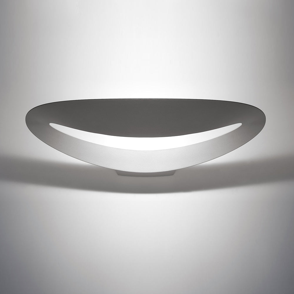 The geometry of the body, sinuous and light like a ribbon, hides the source and also reflects downwards the light emitted mainly upwards, amplifying the emission in space.