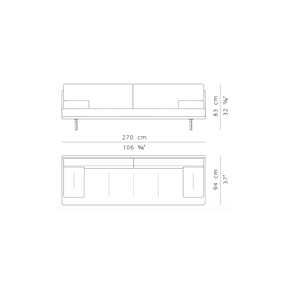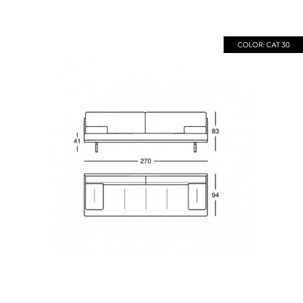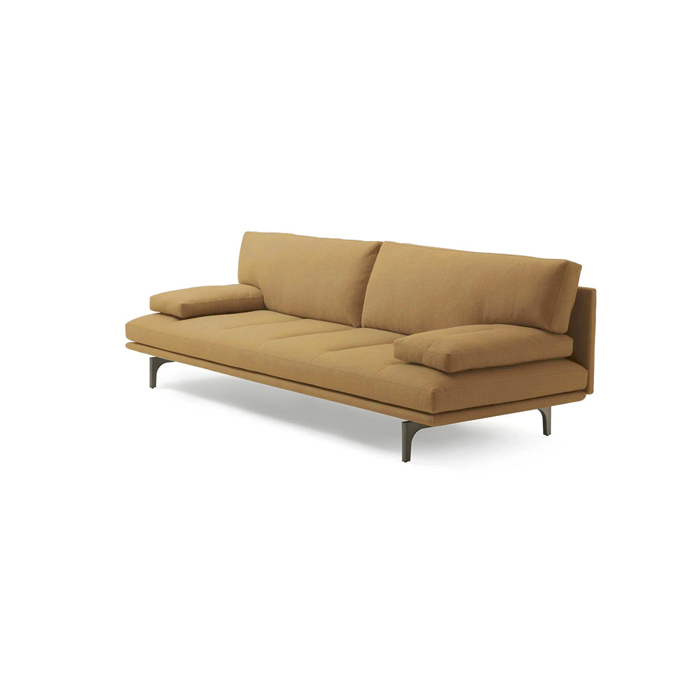 Three-seater sofa in Torre fabric (Cat 30) in camel (032132), 56% cotton, 30% viscose, 14% linen. Removable outer cover. Satin nickel-plated aluminum alloy legs with a black finish.