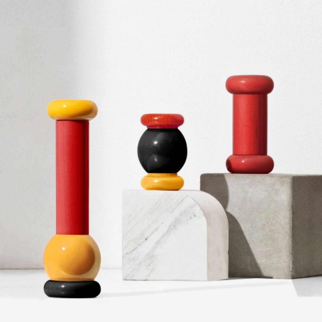 Pepper mill in red, yellow, and black stained beechwood. Designed by Ettore Sottsass. Diameter 7 cm, Height 23 cm.
