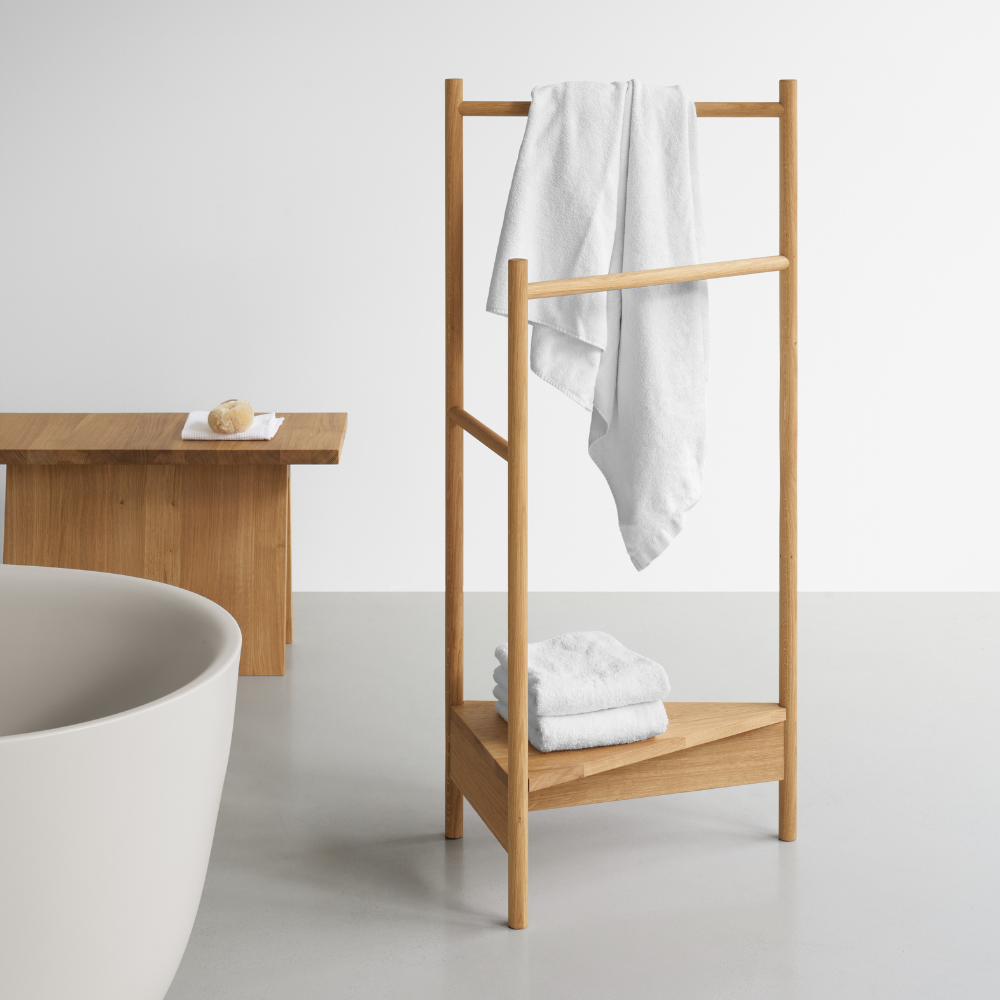 Tripod coat rack. Whether placed freestanding or along a wall, the triangular footprint provides stability and offers space for towels of various sizes. TRIPOD is handcrafted from oiled European oak in a specialized workshop in Germany.