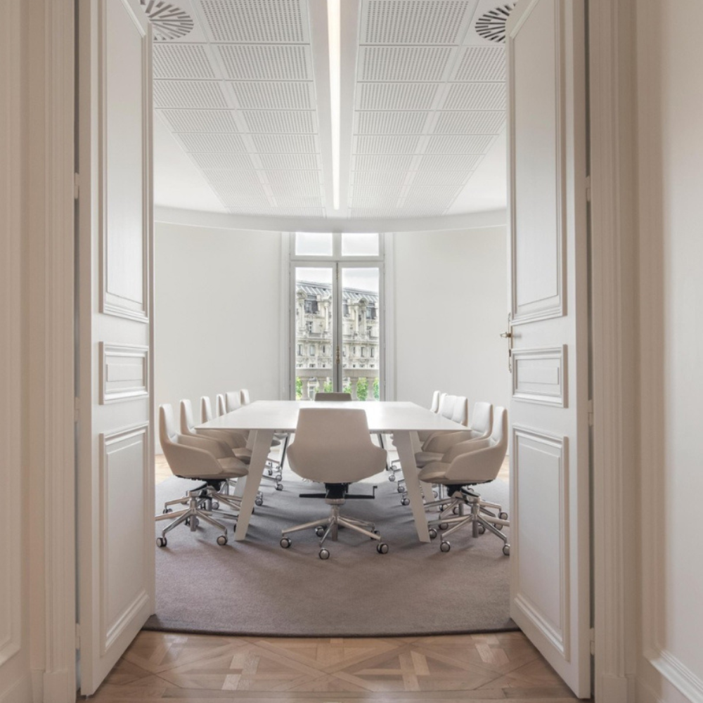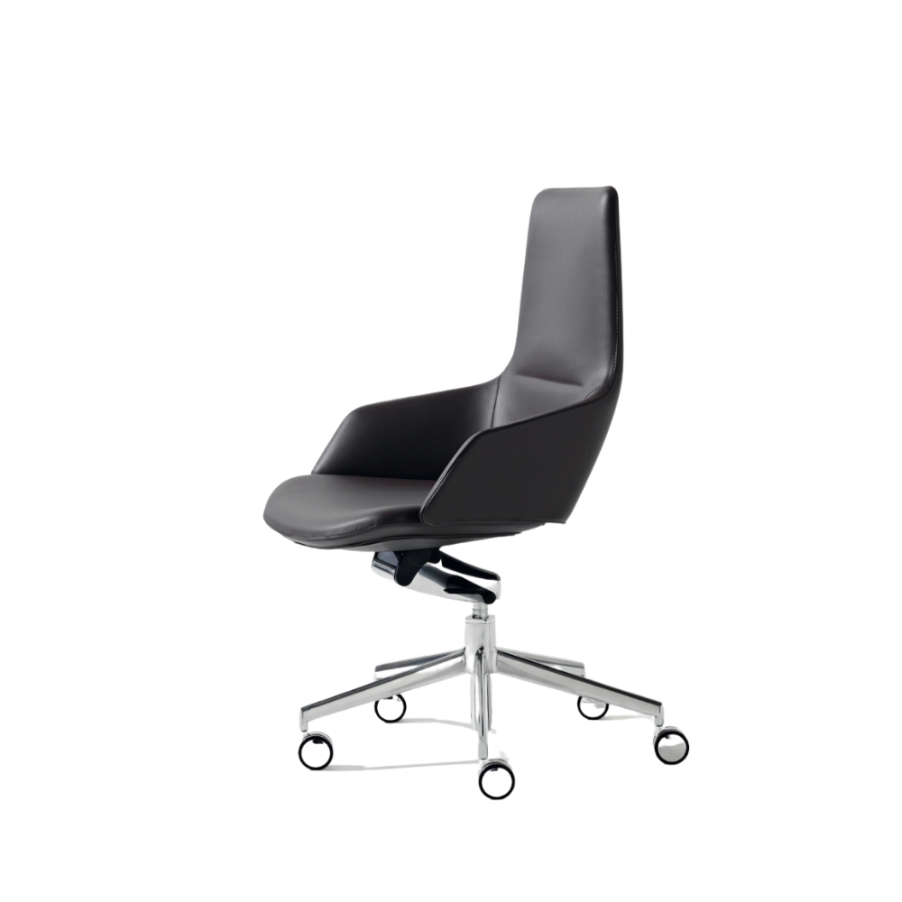 ASTON Office executive chair with a five-star aluminum frame mounted on self-braking casters, equipped with a gas-piston system for height adjustment and a Syncro mechanism. The polyurethane shell with a medium backrest is upholstered in black leather PF00007.